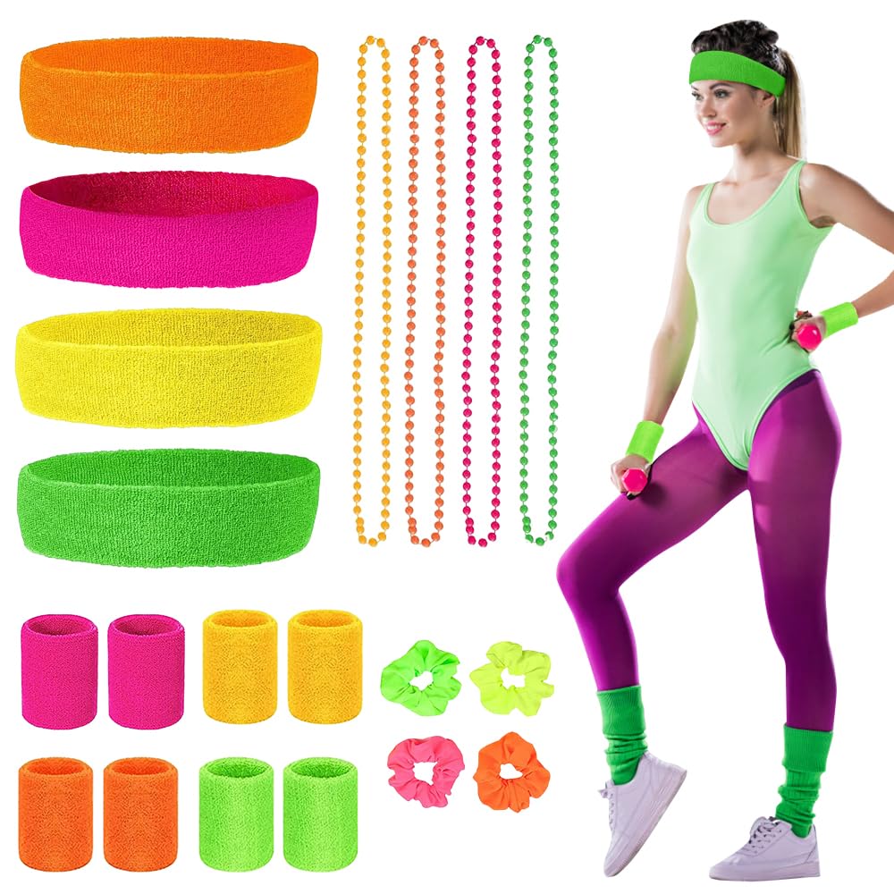 Neon Schweißbänder 80er Jahre Sport-Set Aerobic Stirnband Schweißband
