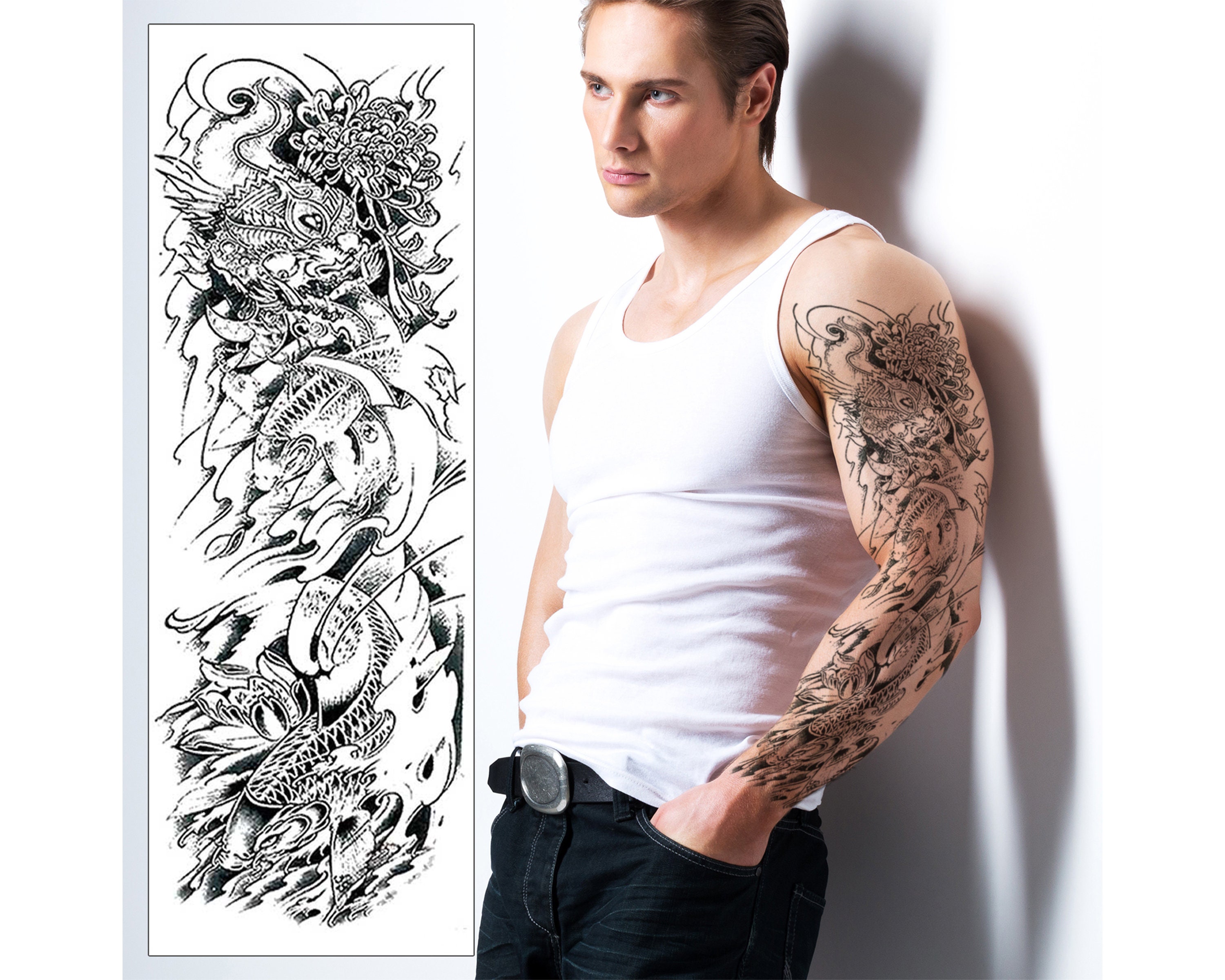 Große Arm Sleeve Tattoo Japanischen Prajna Karpfen Drachen Wasserdicht Temporäre Tatto Aufkleber Gott Körper Art Full Gefälschte Tatoo Frauen Männer