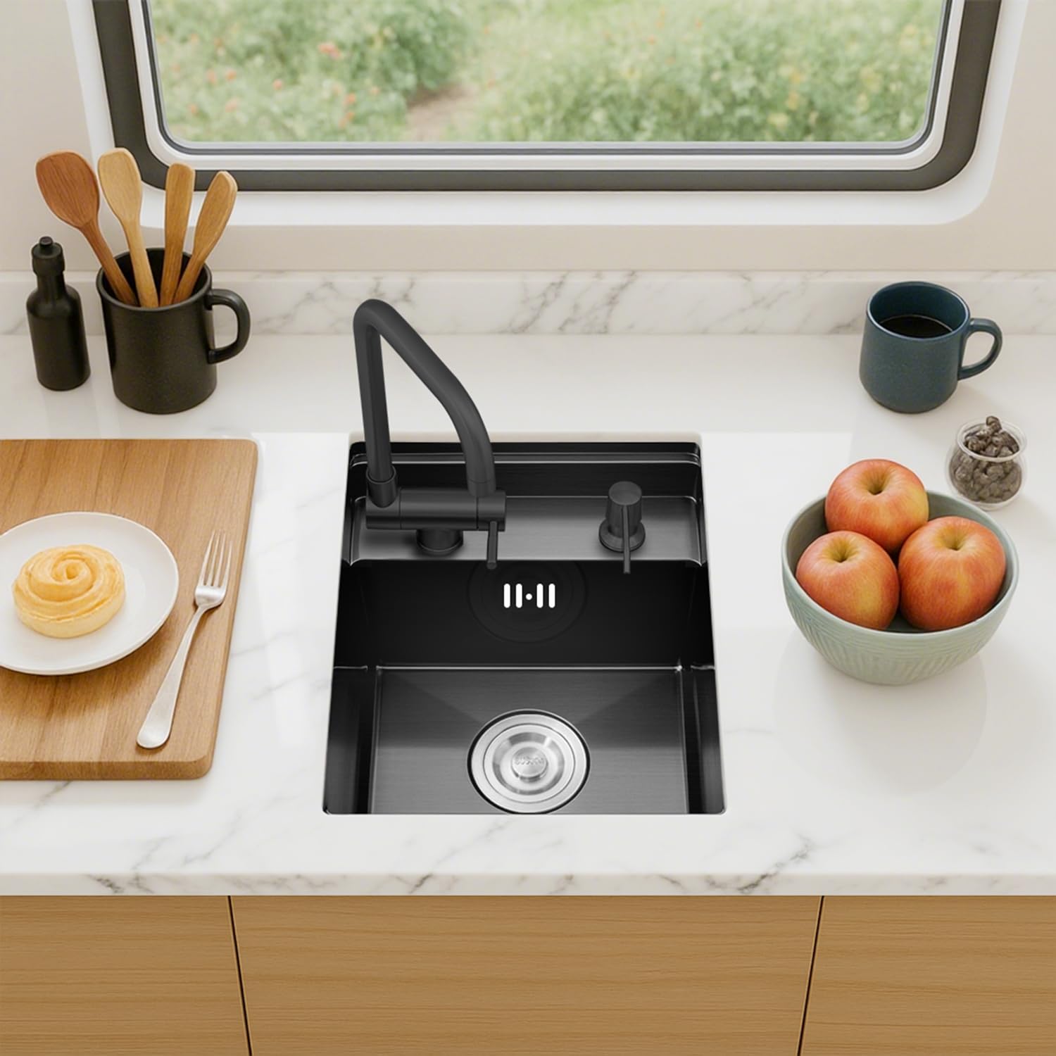 【Vielseitige Einbaumöglichkeiten】 Unterstützt sowohl Einbau- als auch Unterbau-Installationen – kompatibel mit den meisten Standardabläufen und Müllzerkleinerern. Widersteht Flecken, stößt Wasser ab und erleichtert die Reinigung. Diese schützt zuverlässig vor Fingerabdrücken und Fettflecken, bewahrt selbst bei intensiver Nutzung ein neuwertiges Erscheinungsbild, überzeugt durch edles Design und verlängert die Lebensdauer des Beckens deutlich – ideal für den täglichen Gebrauch. Entdecken Sie die hochwertigen Spülbecken der Marke Quadri. Unsere Auswahl bietet professionelle Qualität und modernes Design für Ihre Küche Langlebig, komfortabel und durchdacht bis ins Detail. Hergestellt aus hochwertigen Materialien für dauerhafte Leistung. Sanfte Kurven ermöglichen mühelose Reinigung und verhindern Ablagerungen in den Ecken. TORVA Chrom-Arbeitsstation-Unterbauspüle für Bar-Wohnmobilküche mit eingebautem faltbarem Wasserhahn – 16 Gauge Edelstahl, 33,1 x 38,1 x 17,8 cm 【Flexibler, klappbarer Wasserhahn】 Innovativer, klappbarer Mischhahn mit 180°-Schwenkbereich – lässt sich nach dem Gebrauch vollständig im Spülbecken versenken. Ribanedy Schwarze verdeckte Einzelbecken-Küchenspüle, 30 × 45 cm, Unterbau-Edelstahlspüle für Bar/Campervan, Camping und kleine Räume von Ribanedy. Küchenmodule günstig online kaufen bei Möbel & Garten Zusätzlich verhindert die Anti-Kondensations-Beschichtung das Ansammeln von Feuchtigkeit und schützt so Ihre Küchenschränke vor Nässe. Handgefertigt für Langlebigkeit und einfache Reinigung, in stilvollen Designs und verschiedenen Größen. 【Geräusch- & Feuchtigkeitsschutz】 Mehrlagige Gummimatten an der Unterseite absorbieren wirkungsvoll Wassergeräusche und Aufprallschall für einen ruhigen Küchenbetrieb. Abgerundete Ecken reduzieren Schmutzablagerungen und erleichtern die Reinigung – selbst schwer zugängliche Stellen bleiben hygienisch sauber. Die Abdeckung sorgt für eine flache, erweiterte Arbeitsfläche – ideal zum Abstellen von Küchenutensilien oder zur Vorbereitung von Speisen. 3 mm Stärke sorgt für außergewöhnliche Stabilität und langanhaltende Zuverlässigkeit. Ribanedy Einzelspülbecken aus Edelstahl sind die perfekte Ergänzung für Ihre Küche. Freistehendes Edelstahl-Spülbecken, tragbare Handwaschstation für... Küchenmodule und andere Küchenmöbel günstig online kaufen bei Möbel & Garten. KLAPPBARER WASSERHAHN Ein intelligenter Wasserhahn für jede Aufgabe – Waschen, Vorbereiten, Spülen mit voller Flexibilität 1 KLAPPBARER WASSERHAHN 2 VERSTECKTES DESIGN 3 LEISE & ROBUST Außenmaße : L30 x B45 cm, Innenmaße : L26 x B41 cm, Höhe : H22 cm In Kombination mit der Abdeckplatte entsteht eine flache, durchgehende Arbeitsfläche, die wertvollen Platz in der Küche freigibt.