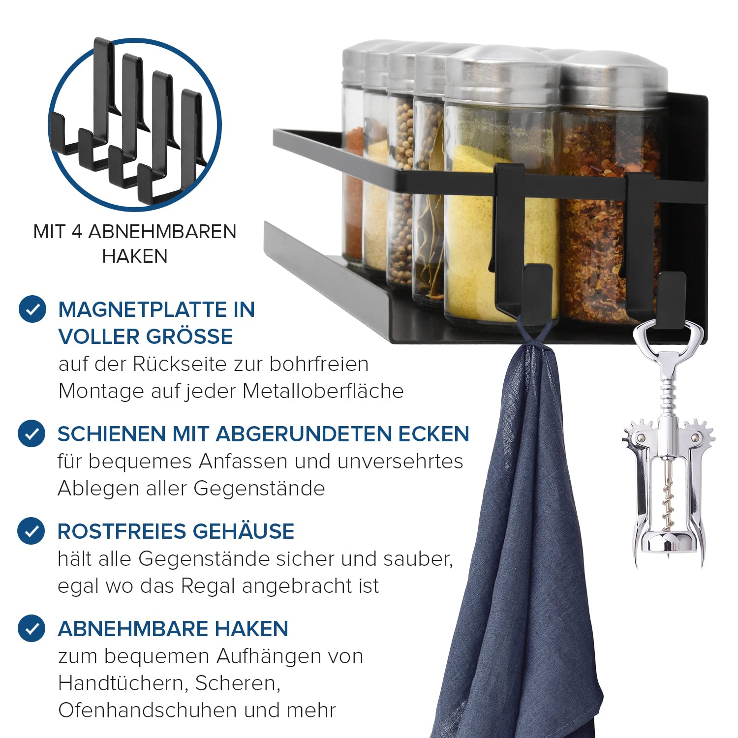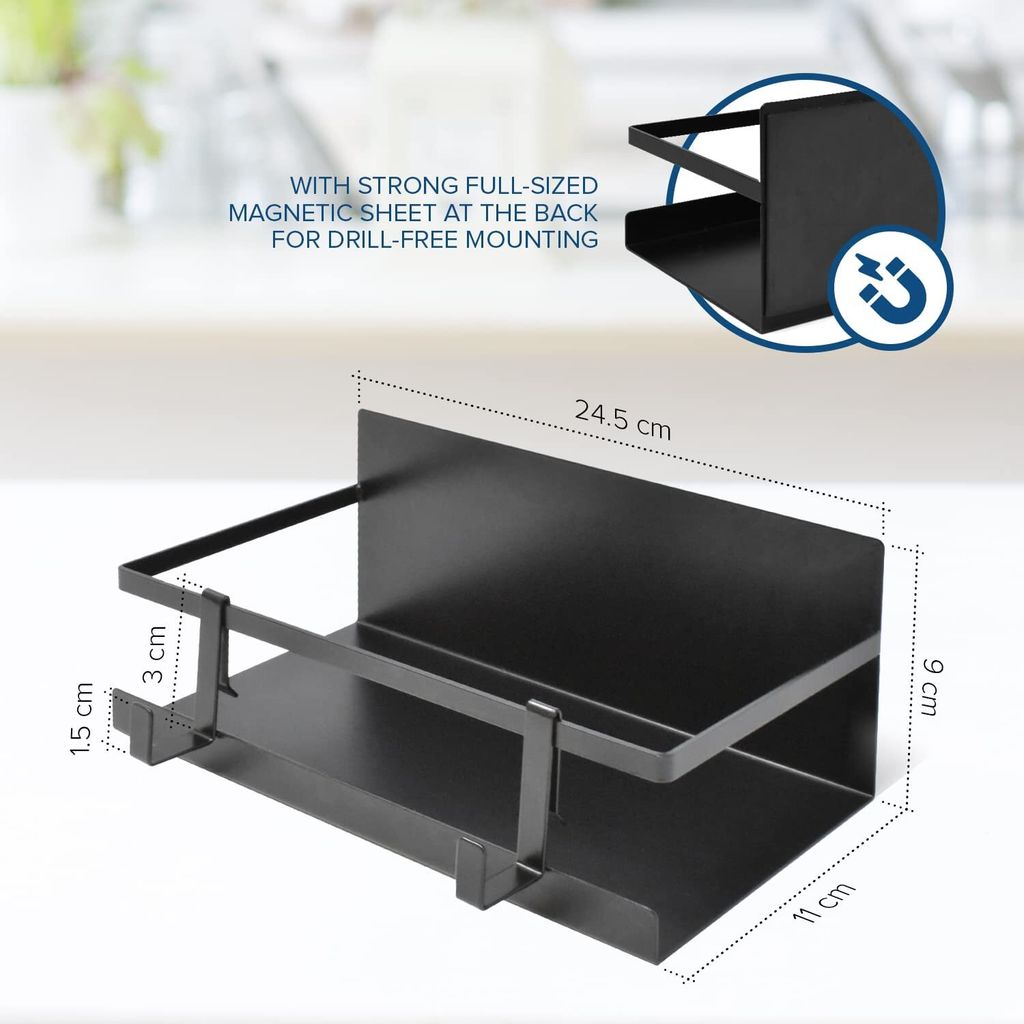 100% Garantie - Wir bieten eine 100% Garantie auf das Regal für Kühlschrank. WEITERE GRÜNDE, DIESES PROUKT ZU LIEBEN Ermöglicht einfache Reinigungen und Wartungen mit einem schlichten Design, das zu den meisten Küchen- und Badezimmereinrichtungen passt. Dieses magnetische Gewürzregal von joeji',s Kitchen ist die ideale Lösung für die Aufbewahrung von Gewürzen und kleinen Küchenutensilien. Es lässt sich problemlos an Kühlschränken, Öfen oder anderen Metalloberflächen anbringen, ohne dass Bohren erforderlich ist Next125 Halterung magnetisch für 15 Gewürzdosen – Küchen Geisler Praktisch -Das Küchenregal magnetisch verfügt über eine gesicherte Reling und eine Bodenrillen-Kombination, damit selbst kleine Gegenstände nicht vom Kühlschrank Magnete Regal herunterfallen. Das magnetische Regal Kühlschrank zerkratzt keine Geräte. Abgewinkelte Ebenen können bis zu 2,5 kg tragen, ohne einzubrechen. Der 24,5 x 12 cm große Magnet Regal Kühlschrank und die 4 Aufhängehaken können bis zu 2,5 kg aufnehmen. Platzsparend - Der Gewürzregal Magnet Halter Küche nutzt Metallgeräte optimal aus, um Platz in Schränken und auf Arbeitsplatten zu schaffen. Das minimalistische Design macht dieses magnetisches Gewürzregal leicht zu reinigen und es passt zu jeder modernen Einrichtung. Lässt sich leicht an jeder magnetischen Oberfläche befestigen und ermöglicht so eine schnelle und langfristige Entrümpelung. Abgewinkelte Ebenen können bis zu 2,5 kg tragen, ohne einzubrechen Strapazierfähig - Aus verzinktem Stahl gefertigt, rostet dieses magnetisches Kühlschrankregal auch in feuchten Räumen nicht. 1 NEBEN DEM KÜHLSCHRANK 2 IN DER NÄHE DES HERDS 3 FÜR DIE WASCHKÜCHE 4 BADEZIMMER Der starke Magnet auf der Rückseite des Magnet Gewürzregal verhindert, dass es in den Kühlschrank oder den Ofen rutscht. Gewürz Regal BBAUER Gewürzregal Magnetisch Kühlschrank, Magnet Regal Kühlschrank Mit Regal Schwarz Wenn Sie mit dem Magnet für Küche Magnet nicht zufrieden sind, kontaktieren Sie uns bitte.
