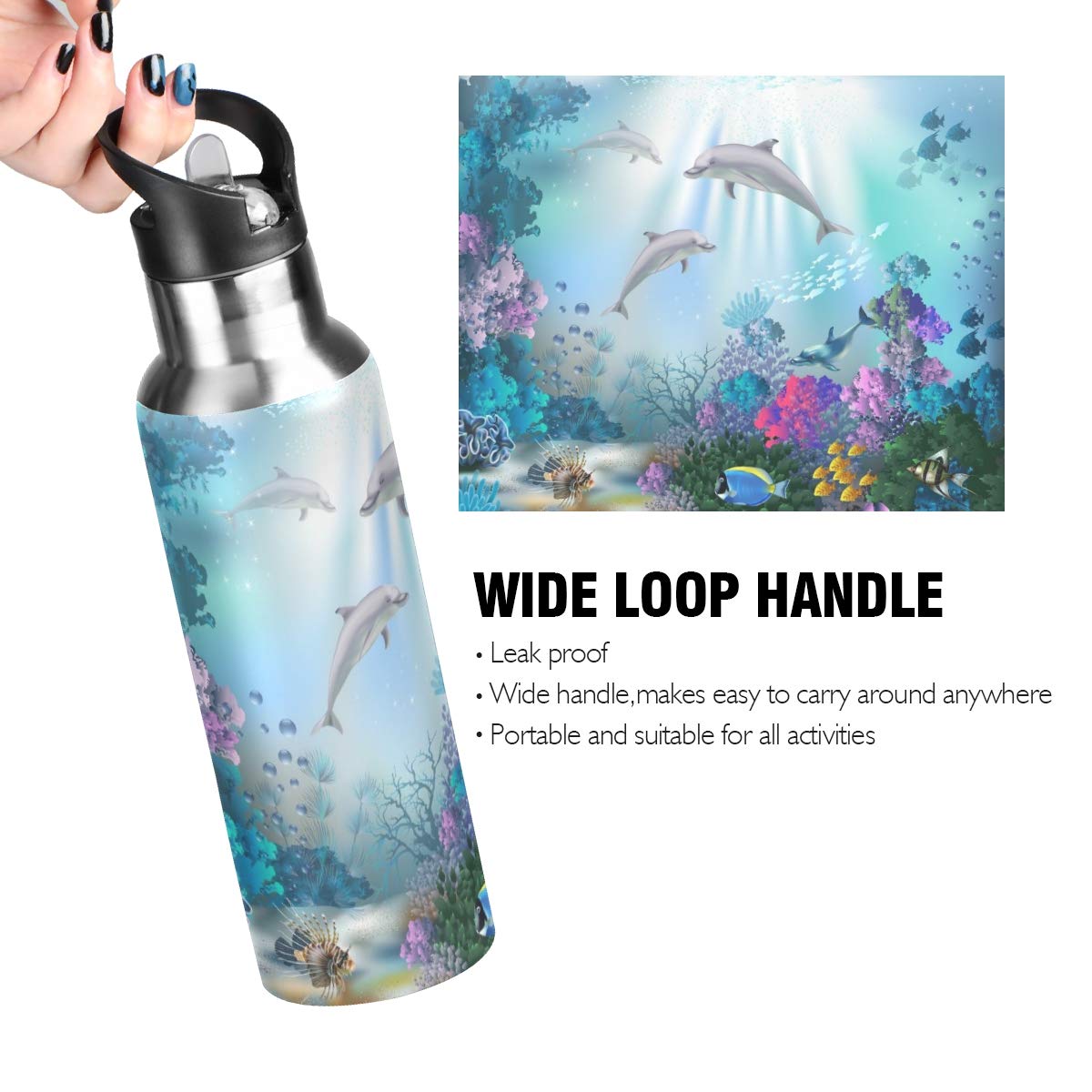 KEEPREAL Unterwasserwelt Der Delfine, Sport-Wasserflasche, 625 Ml, BPA-frei, Ungiftig, Edelstahl, Wasserflasche Mit Strohhalm Für Fitnessstudio, Yoga, Fitness, Camping
