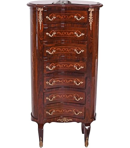 Bringen Sie mit diesem Möbelstück den Glanz von Versailles in Ihr Zuhause und verleihen Sie Ihren Räumen barocken Luxus. Barock Kommode Nussbaum Süddeutschland - Antikhof Brück Authentischer Vintage-Charme: Antik-patinierte Oberfläche mit leichten Gebrauchsspuren und schonenden Restaurierungen verleiht historische Tiefe und Echtheit. Die Barock-Kommode „Château de Versailles“ vereint königlichen Pomp mit meisterhafter Handwerkskunst. Prunkvolle Messingapplikationen: Edle Beschläge in Blüten- und Volutenform rahmen jede Schublade ein und setzen luxuriöse Glanzlichter. 20 × 27 × 7 cm) bieten reichlich Stauraum für Wäsche, Wäscheutensilien oder persönliche Schätze. Casa Padrino Barockstil Kommode mit 3 Schubladen in braun Intarsien / gold 100 x 50 x H. 80 cm - casa padrino barock barockstil wohnzimmer hotel kommode schrank wohnzimmerschrank mit schubladen möbel Die Barock-Kommode „Château de Versailles" ist eine imposante Semainière im prunkvollen Barockstil und vereint majestätische Eleganz mit höchster Funktionalität Aus der Luxus Barock Kollektion von Casa Padrino! Gefertigt aus massivem Holz und kunstvoll intarsiert mit verschiedenen Edelhölzern, beeindruckt dieses Schmuckstück durch seine opulenten Verzierungen und feinen Maserungskontraste. Majestätische Intarsien-Kunst: Die „Château de Versailles“ Kommode besticht durch filigrane Intarsien aus verschiedenen Edelhölzern – jedes Muster ein handgefertigtes Unikat. Kommode 50cm Breit BAROCK KOMMODE „CHÂTEAU De Versailles ... - DE Kommode 50 Cm Breit 118 cm Höhe, 50 cm Breite und 30 cm Tiefe eignet sich die schlanke, hohe Kommode ideal als Wäschekommode im Schlafzimmer, elegante Nachttisch-Alternative oder repräsentative Ablage im Salon. Casa Padrino ist ein europaweit renommierter Produzent und Vertrieb von Barock Möbeln und ein eingetragenes Warenzeichen beim deutschen Patent und Markenamt.