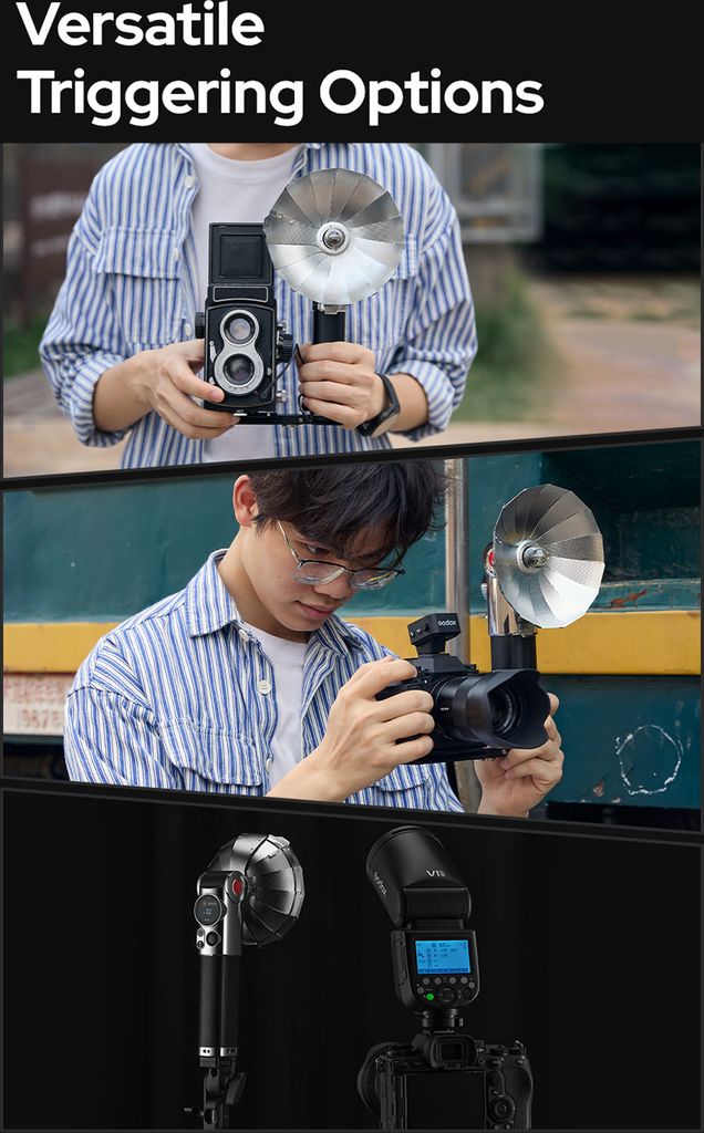 【Eingebauter wiederaufladbarer Typ-C-Akku】Lux Master verfügt über einen eingebauten 7,2-V-2980-mAh-Lithium-Akku, der eine leistungsstarke Ausgangsleistung bietet und bis zu 460 Blitze bei voller Leistung erzielen kann. Ausgestattet mit einem klassischen faltbaren Fächerreflektor und einem effizienten Farb-Touchscreen verbindet Lux Master mühelos den nostalgischen Glanz vergangener Zeiten mit dem modernen Komfort von heute. Das Koppeln Ihres X3 ist einfach – klicken Sie einfach auf Wireless Sync auf Ihrem X3., Es bietet Ihnen ein Erlebnis, das über die Effizienz hinausgeht. Sony Blitz GODOX Lux Master Retro-Kamerablitz, 2,4 G HSS TTL Vintage Blitz Sony Camera Die Skalenerkennung ermöglicht eine präzise Winkeleinstellung und sorgt so für natürliche, professionelle Lichteffekte. Oder verwenden Sie zum Auslösen einen Master-Blitz wie V1Pro oder schließen Sie ein PC-Kabel an, um den Blitz auszulösen. Seine Konturen wurden sorgfältig ausgearbeitet und ergonomisch gestaltet, um eine mühelose Einhandbedienung zu gewährleisten. Bestellen Sie jetzt versandkostenfrei den Godox Lux Master Retro Kamerablitz bei Ihrem Fotofachhändler Foto Leistenschneider Das Aufladen erfolgt schnell und einfach über den USB-C-Anschluss, die Ladezeit beträgt ca., 2 Stunden. Blitzgerät wie damals: Retro Aufsteckblitz von Godox... Lux Master bietet modernen Komfort mit TTL-Autoblitz und sorgt für mühelose, präzise Blitzbelichtungen. Das Aufladen erfolgt schnell und einfach über den Typ-C-Anschluss, die Ladezeit beträgt etwa 2 Stunden. Einfache drahtlose Synchronisierung Lux Master kann nahtlos mit Triggern wie X3, Xproll und X2T zusammenarbeiten. 【Unterstützt TTL und HSS】Unter Beibehaltung eines Vintage-Looks bietet Lux Master modernen Komfort mit TTL-Autoflash und sorgt so für mühelose, präzise Blitzbelichtung. 【2,4G Wireless-Synchronisation】Lux Master kann nahtlos mit Triggern wie X3, Xproll und X2T zusammenarbeiten. Das Koppeln mit dem X3 ist so einfach wie nie zuvor – tippen Sie einfach auf die drahtlose Synchronisierung auf dem X3 und auf das Synchronisierungssymbol auf dem Lux Master, und die Synchronisierung erfolgt im Handumdrehen drahtlos. Godox TT685 II O - Blitzgerät f. Olympus/Panasonic - Foto Erhardt