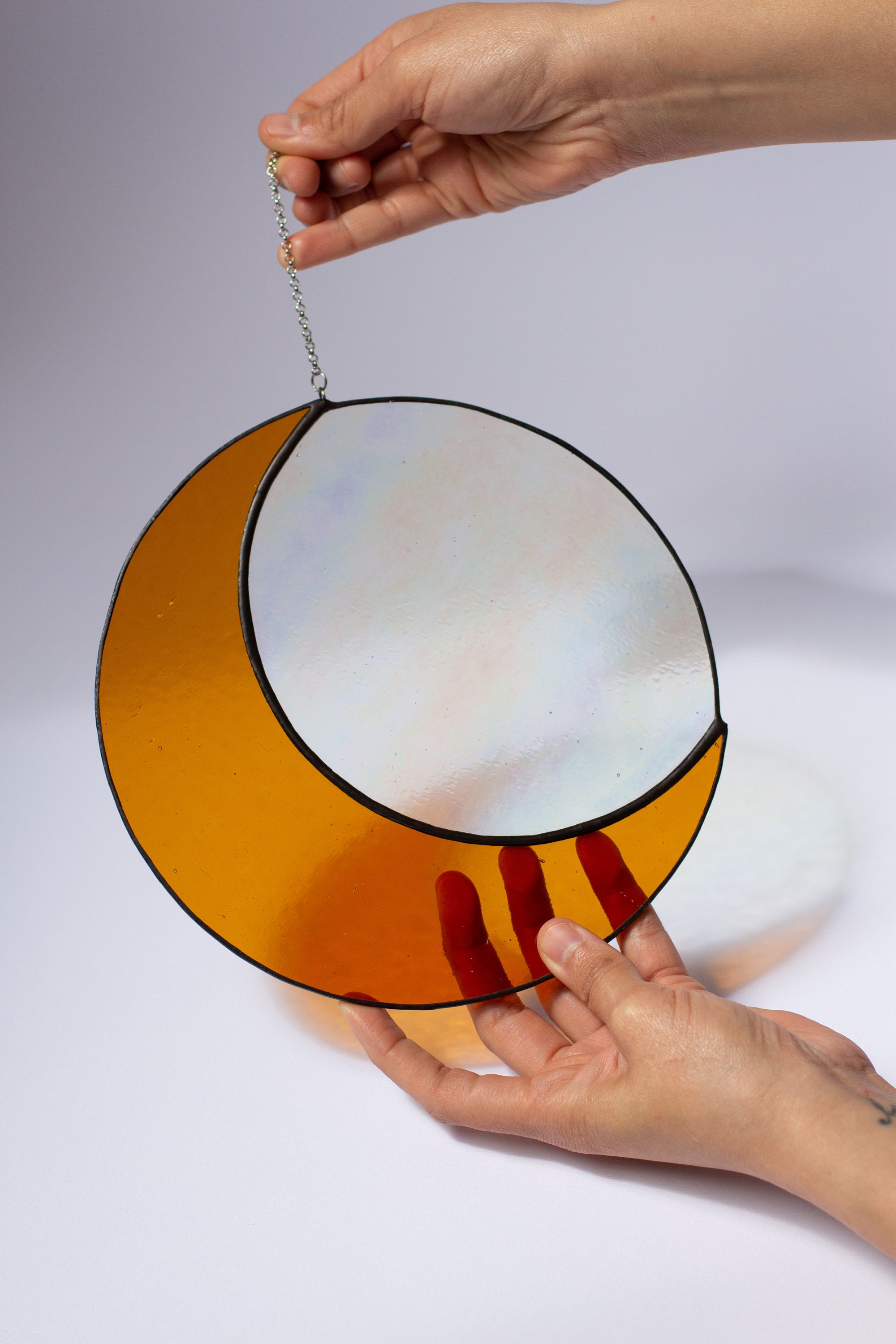 Handgefertigt: 100 % handgefertigt aus echtem Buntglas Moon Buntglas-Sonnenfänger für Fensterbehang, handgefertigt, Kunstglas, Halbmond-Dekorationen, Innenfenster für Wohnzimmer, Schlafzimmer (Rosa Außerhalb der Reichweite von Kindern und Haustieren aufbewahren. Sonnenfänger Fenster Karhuimoyi Moon Buntglas-Sonnenfänger Für Fensterbehang Fensterdeko Hängend Nicht für den Außenbereich geeignet. Traumfänger, Sonnenfänger, Kristall-Sonnenfänger, Innenfenster, Prisma, Kugel, Mond, Regenbogen, Windspiele, Auto, zum Aufhängen, Gartenkoration, Geschenk Sonnenfänger – Mandala/Typ7 Wir präsentieren Ihnen einen eleganten Sonnenfänger mit Mandalamuster, der Ihrem Zuhause einen Hauch von Luxus und Mystik verleiht. Schafft ein beruhigendes Ambiente: Hängen Sie diesen Mondsonnenfänger in Ihrem Zuhause, um eine friedliche und ruhige Atmosphäre zu schaffen..Egal, ob es in Ihrem Wohnzimmer, Schlafzimmer oder Büro ist, es bringt einen Hauch von Ruhe mit und lädt positive Energie und Harmonie in den Raum ein Seine zeitlose Schönheit und Symbolik machen es zum perfekten Geschenk für einen geliebten Menschen oder zu einer außergewöhnlichen Ergänzung für Ihr Zuhause.