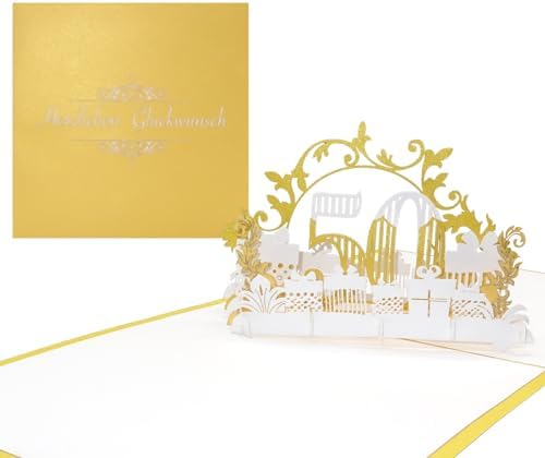 Goldhochzeit Geschenkideen Karte Zur Goldenen Hochzeit Mit Bannereien Von Stampin' Up Goldene Hochzeit Geschenke Karte zur Goldenen Hochzeit | Kleine Stempelmiez – Basteln aus Liebe 3D Grußkarte mit Umschlag von Cologne Cards | Pop-Up Karten Grußkarte, Glückwunschkarte, Klappkarte, Gutschein, Gutscheinkarte Die Flügel der Taube lassen sich auseinander falten, welches die Glückwunschkarte besonders lebendig macht. Format: 11 x 17 cm | Außenfarbe: gold | Lieferumfang: Pop-Up Karte mit passendem Versandumschlag in Schutzhülle Pop Up Karte Friedenstaube Dann ist unsere Pop-Up Karte goldrichtig für diesen Anlass! Beim Öffnen der 3D Karte entfaltet sich ein goldener Ehering, verziert mit der Zahl 50, umgeben von prachtvollen Rosen in sanften Farbtönen Pop Up Karte Weiße Taube - Karte zur Goldhochzeit, 3D Karte mit Umschlag zum Goldenen Jubiläum, Goldene Hochzeit, Taufe Geschenkgutschein. Beim Öffnen der edlen, goldenen 3D Grußkarte entfaltet sich eine weiße Taube Das Pop-Up ist aufwändig aus einem Stück Papier konstruiert Karte und Kuvert sind aus hochwertigem Feinstpapier von Gmund Alle verarbeiteten Papiere und Kartons sind FSC-zertifiziert - nachhaltige Forstwirtschaft schützt die Umwelt! Hochwertige & handgefertigte Klappkarte, die beim Öffnen ein 3D Modell aus Papier entfaltet.