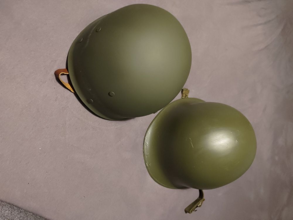 Helmet For Sale US ARMY GI Stahlhelm M1 Mit Kinnriemen Steelhelmet USA WW2 WK2 EUR 75,00 - DE Helmet Original WW2 US Army M1 Steel Military Helmet Replica, WW2 Gear, WW2 Uniform, Vietnam War Dies sorgt für eine eng anliegende, bequeme Passform für längeres Tragen, sodass Benutzer Aktivitäten ohne Beschwerden oder häufige Anpassungen ausüben können. Es kann auch als Filmrequisite oder ein einzigartiges Geschenk verwendet werden, was ihn zu einer vielseitigen Ergänzung für die Ausrüstung jedes Enthusiasten macht. Die hochwertigen Materialien sorgen für lang anhaltende Leistung und zuverlässigen Schutz und emulieren die Robustheit der ursprünglichen M1-Helme, die während des Zweiten Weltkriegs verwendet wurden. Authentische Nachbildung des Zweiten Weltkriegs: Originalgetreue Nachbildung des ikonischen M1-Helms, der von amerikanischen Soldaten während des Zweiten Weltkriegs verwendet wurde. Verstellbare Passform für Komfort: Dieser Helm wurde für Kopfgrößen von 50,5 bis 62 cm entworfen und verfügt über ein verstellbares Gurtsystem mit einer sicheren Schnalle und einem anpassbaren Innenring. Produktbeschreibung M1-Helm aus dem 2. Weltkrieg, Reproduktion des M1-Helms in den USA während des Zweiten Weltkriegs, genau das gleiche wie der ursprüngliche M1-Helm, Details wie Größe, Form, Konstruktion, Material, Verbundstoff, Farbe usw. Paket beinhaltet Canvas Kinnriemen, Netzabdeckung, Katzenaugengurt, Hüftgurt. Perfekt für Sammlerstücke, Outdoor-Spiele, CS-Spiele, Filmrequisiten... Aus Privatsammlung - Original US WW2 M1 Stahlhelm, Original WW2, Falz der Bördelung vorne, Swivel Bale, Glocke neu lackiert, ersetzter Repro Canvas Kinnriemen..mit Original WW2 Firestone Liner Original Helm von US GI Soldaten aus dem Jahr 1974 mit Mitchell Helmbezug und Innenhelm. Diese Eigenschaft macht es ideal für taktische Spiele, Paintball oder Airsoft, wo es entscheidend für den Erfolg ist, unsichtbar zu bleiben.