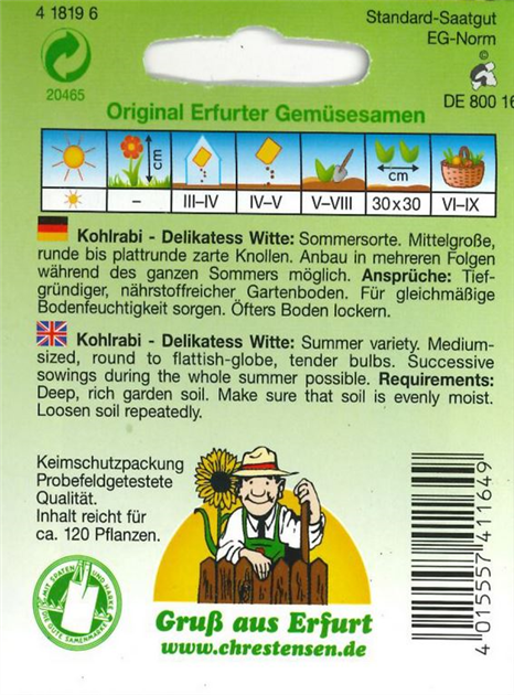 IDEAL FÜR VERSCHIEDENE ANWENDUNGEN: BIO Kohlrabi Delikatess Witte eignet sich hervorragend für die Zubereitung von leckeren Beilagen, Suppen oder Salaten. Zudem ist er lagerfähig über den Winter, sodass Sie auch in der kalten Jahreszeit frisches Gemüse genießen können. Calliaropes Delikatess blauer – eine gelungene Sorte, für die man sich bedankt! Dies fördert nicht nur die Nachhaltigkeit, sondern auch Ihre Unabhängigkeit als Gärtner. PLATZFEST UND LAGERFÄHIG: Der BIO Kohlrabi Delikatess Witte überzeugt durch seine Platzfestigkeit, was bedeutet, dass er auch bei optimalem Wachstum in der Erde bleibt und nicht überreif wird. Die Pflanzen sind robust und ertragreich, was sie perfekt für den Anbau im Garten, Hochbeet oder auf dem Balkon macht. Mit einer Keimtemperatur von 15-20°C ist der Anbau unkompliziert, und die Aussaat kann bereits ab Februar erfolgen. Der Erntezeitraum erstreckt sich von Mai bis Juli, sodass Sie über mehrere Wochen frischen Kohlrabi ernten können. Kartoffel Samen Kohlrabi / Weisser - Brassica Oleracea Var. Gongylodes Wilder Brokkoli Samen Alte Sorte - BIO-Kohlrabi Delikateß blauer - Saat & Gut Kohlrabi / Delikatess Witte - 100 Samen | 4942 Der Kohlrabi 'Delikatess Witte' bildet zarte, runde Knollen mit kräftigem Aroma. Geeignet für die gesamte Freilandsaison im Beet. Auch die jungen Blätter sind eine Delikatesse. Sie werden wie Spinat zubereitet Die Pflanzen sind nachbaufähig, sodass Sie Ihre eigenen Sämereien für die nächste Saison gewinnen können. Bestellen Sie unbedingt die Samen, Sie werden sehr zufrieden sein! HERVORRAGENDE QUALITÄT: Dieses samenfeste Saatgut stammt aus kontrolliert biologischer Landwirtschaft, wodurch die Qualität und Reinheit garantiert sind.