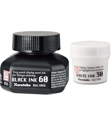 Schöne mattschwarze Farbe, empfohlen zum Zeichnen von Linien mit Farbillustrationen. Perfekte Tinte zum Zeichnen von Linien und Kleben von Manga und Illustrationen., Super schwarze Tinte Material: Flüssigkeit: Ruß/Harz, Behälter: PE, Kappe: PP Sumi Ink Kuretake Zig Cartoonist Super Black Ink 60 Ml For Dip Pen, Calligraphy, Lettering, Illustration, Drawing, Inking Art, Cartooning, Professional Quality, Made In Japan Handlettering Anfänger Set