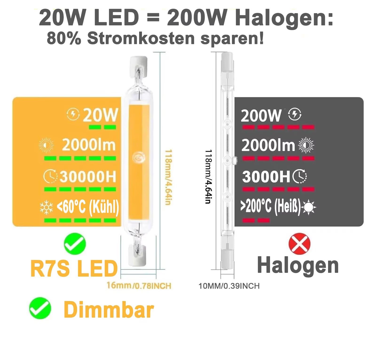 Hsientpe R7S LED 118mm Dimmbar,30W R7S LED Ersatz Für 300W