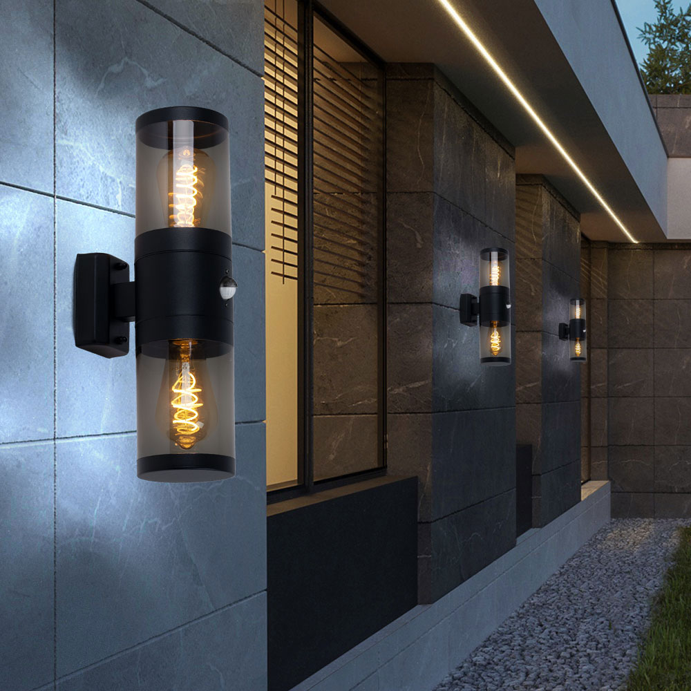 Laternen Für Draußen Groß LED Wandleuchte, Stehlampe, Up Down, Edelstahl, Sensor, Holz-Optik | ETC Shop Außenbeleuchtung Haus Aussenleuchten mit Bewegungsmelder + 10W LED neutralweiß E27 Fassung Dies schont die Umwelt und Ihren Geldbeutel. Breite oben und unten: 16cm Beschreibung Diese Wandleuchte verschönert jeden Außenbereich! Details Leuchte • Typ: Wandlampe• Material: Edelstahl, poliert; Kunststoff, opal• Schutzgrad: IP44• Fassung: 2x E27 • Leuchtmittel enthalten: Ja• Leuchtmittel: 2x 10 Watt Maße: • Höhe: 35cm• Breite oben und unten: 16cm• Breite Mitte: 9,5cm• Tiefe oben und unten: 9,5cm• Tiefe Mitte: 6cm Details Leuchtmittel • Leuchtmitteltyp: LED• Sockel: E27• Bauform: Kugel (weiß-opal)• Material: Kunststoff • Lichtstrom: 806 lm (Lumen)• Energieverbrauch: 10 kWh/1000h• Farbtemperatur: 2700 K (Kelvin)• Lichtfarbe: warmweiß• Farbwiedergabe (Ra): 80• Nennleistungsaufnahme: 10 W (Watt)• Energieersparnis: 80%• Bemessungsspitzenlichtstärke: 100 cd (Candela)• Vergleich zur normalen Glühbirne: 10 Watt = 60 Watt• Nennlebensdauer: 20., 000 h (Stunden)• Schaltzyklen: 15., 000x• Betriebsspannung: 220-240 V (Volt)• Netzfrequenz: 50 Hz (Hertz)• Quecksilbergehalt : 0 mg (Milligramm)• nomineller Halbwertswinkel: 200° (Grad)• Umgebungstemperatur: -20° bis +45°• Dimmbar: nein • Maße L x Ø in mm: 112 x 60• Anlaufzeit bis 60%: 1s (Sekunden), Typ: Wandlampe Bei dieser Leuchte sollten Sie nur Energiesparlampen verwenden. Dank ausgeklügelter LED-Technik und integrierten, dezenten Leuchtmitteln sind die Up- & Down Wandleuchten in vielen minimalistischen, schlichten Designs erhältlich Interessantes Design, schöne Form und klassische Eleganz - diese Außenleuchte fügt sich harmonisch in ihre Umgebung ein und vermittelt eine angenehme Atmosphäre LED Solar Wandleuchte PIR Bewegungsmelder, IP44, anthrazit Produktdetails Ausgesprochen stylische Solar Wandleuchte mit PIR-Bewegungsmelder in matt anthraziter 276864760257 Material: Edelstahl, poliert; Kunststoff, opal , Schutzgrad: spritzwassergeschützt , Höhe: 35cm