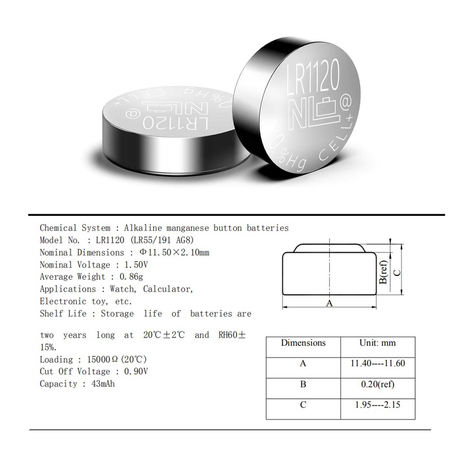 Camelion Alkaline AG8, LR1120, LR55, 191, SR1120W, GP91A, 391 0% Mercury/HG, 10 Stück Produktbeschreibung des Artikels: Camelion Alkaline AG8 0% Mercury/Hg; Batterie-Typ: AG8LR 55; Maße (x H mm): 11,6 x 2,15; Gewicht (g): 0,87; Nennkapazität: 42 mAh bei 0,9 V (20° ± 2 °C bei 6,8 K kontinuierlicher Unterstützung); EAN: 4260216454967; Lieferumfang: 10 Batterien 10x Camelion AG8 LR55 Alkaline Knopfzelle Batterie | G8 LR1120 191 GP91A SR1120W | 1,5V 42mAh, Knopfzellen
