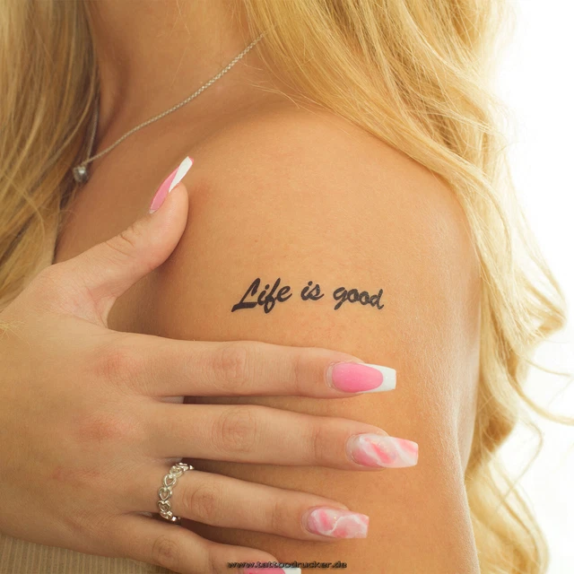 4 X VIVA La Vida Tattoo Schriftzug In Schwarz - DE Rechtliche Hinweise Weitere Tattoos im Shop Anleitung beachten - Tattoos sind wasserfest. Vor dem Auftragen die Haut reinigen 1., Die Schutzfolie abziehen., 2., Das Tattoo auf trockene und fettfreie Haut kleben., 3., Die Rückseite mit einem feuchten Tuch komplett befeuchten und andrücken., 4., Nach ca. Zum Entfernen ganz leicht mit Babyöl einreiben und anschließend mit einem Tuch abrubbeln. Die Tattoos können bis zu mehreren Tagen halten (je nach Hauttyp und mechanischer Belastung) und sind zudem wasser- und seifenfest. Nach dem Trocknen tupfen Sie das Tattoo mit einem feuchten Tuch ab um Klebstoffreste zu entfernen und um das Tattoo noch zusätzlich anzudrücken., Achtung! Die Anwendung ist kinderleicht. Einsatzgebiet: Auto, Motorrad, Wohnwagen, Karosserie, Motorhaube, Vitrine, Tür, Kühlschrank, etc. Motiv: Viva la Vida Schriftzug. Glänzende UV-beständige Farben... 4 x Viva la Vida Tattoo Tattoo - Temporary Haut Tattoo - Keine China Produktion! Deutsche Anleitung auf jede Rückseite inklusive Vordruck als Positionierungshilfe Bewertungen und Kommentare zu diesem Tattoo findest Du bei Die Tattoos sind seifen- und wasserfest!
