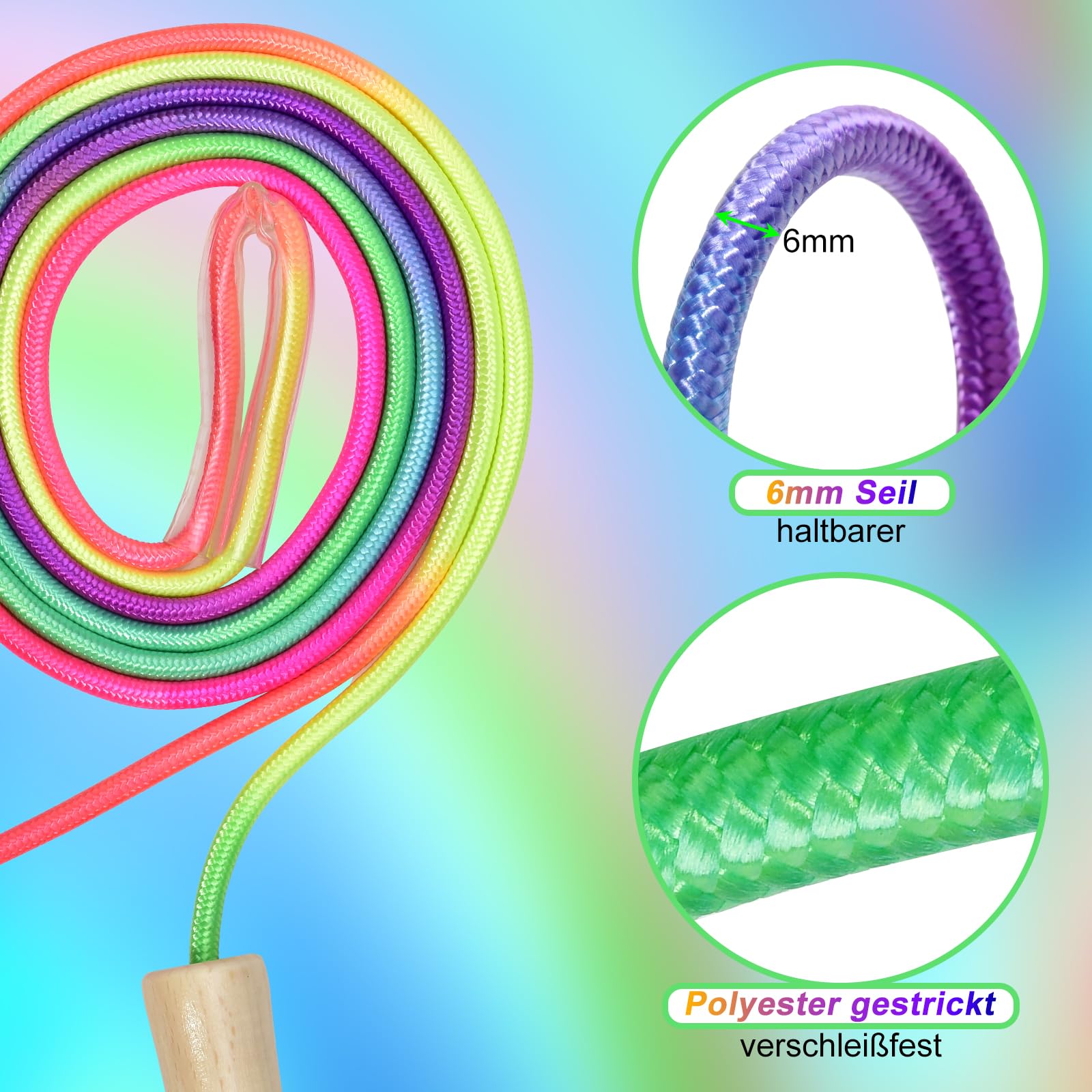 Geeignet für alle Altersgruppen: perfekt für Erwachsene, die Bewegung mit Spaß und Koordinationsherausforderungen kombinieren möchten. Gymnastik-Springseile Regenbogen, 6 Stück online kaufen » HABA Pro Erleben Sie den Nervenkitzel, synchron mit Freunden in endlosen Mustern zu springen, perfekt für Gruppenspiele und Teambildungs-Momente. Geeignet für Erwachsene. Lebendiges Design: Dieses 6 m lange regenbogenfarbene Springseil verfügt über verwobene blaue, gelbe, rote und grüne Seile, die Ihrem Spiel einen Hauch von Farbe verleihen. Bleiben Sie im Trend und genießen Sie den Spaß mit Ihren Freunden! Gruppen-Springseil]: Das Team-Springseil ist für die gleichzeitige Verwendung durch Personen geeignet. [Vielseitig einsetzbar]: Springseil mit Holzgriff, ideal für Multiplayer-Sporttraining und Fitnessübungen Jump Ropes For Fitness LAON Korean Group Jump Rope, 20ft (6m) Long, Rainbow Braided Design With Non-Slip Handles, Skipping Rope, Perfect For Outdoor Activities (Red, Green, Blue Handles) (Green Rainbow Rope Candy Unser Springseil ist im Hinblick auf Langlebigkeit und Sicherheit gefertigt, entworfen, um hochintensiven Anwendungen standzuhalten und ein reibungsloses, zuverlässiges Erlebnis zu bieten. Springseil für Erwachsene, Fitness Sprungseil it verstellbaren...
