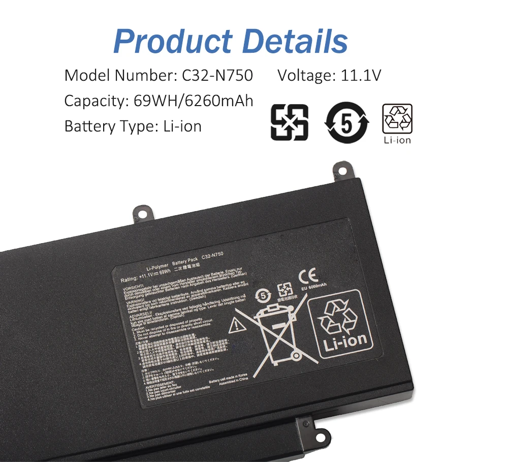 Spezifikationen: Volt: 11,1 V | Kapazität: 69Wh | Recycling: bis zu 500 Ladezyklen für die Lebensdauer der Batterie Sie hängt auch von der Nutzung durch den Benutzer ab. Wir verwenden nur die hochwertigsten Akkus, die bis zu 500 Ladezyklen überstehen können. Stellen Sie sicher, dass Sie den richtigen Akku haben. Hinweis: Die Nutzungsdauer eines vollständig aufgeladenen Laptops hängt von einer Reihe von Faktoren ab, darunter die Akkukapazität, die Nutzungsumgebung und die Nutzungsintensität. Wenn der Computer längere Zeit nicht benutzt wird, halten Sie die Stromversorgung des Computers auf etwa 80%, bevor Sie ihn ausschalten, und versuchen Sie, den Akku von Zeit zu Zeit aufzuladen. Wird das Gerät zum Abspielen hochauflösender Videos, zum Spielen umfangreicher Spiele oder für intensive Arbeiten verwendet, ist die Akkulaufzeit deutlich kürzer. Laptop Akku WYGUO C32-N750 C32N750 Laptop Battery Replacement For Asus N750 N750J N750JK N750JV N750Y47JK-SL N750Y47JV-SL Series Batterien C32 Ersatz Akku C32-N750 für Asus N750 N750JV N750 N750JK series - hier klicken Laden und entladen Sie den Akku einmal im Monat, trennen Sie die Stromversorgung, verwenden Sie die Akkuleistung bis zu 20-30% Restleistung, damit der Akku aktiv bleibt. HOCHWERTIGE KOMPONENTEN: Unsere Laptop-Akkus werden aus hochwertigen Materialien und Platinen hergestellt, um Haltbarkeit und Leistung zu gewährleisten. Cheap Asus N750JK-T4193H 11.1V 6260mAh 69Wh Replacement Battery Kompatibilität: Akku für ASUS N750, N750J, N750JK, N750JV Series N750Y47JK-SL, N750Y47JV-SL Series 0B200-00400000, C32-N750 Ersatz Akku C32-N750 für Asus N750 N750JV N750 N750JK series - hier klicken.