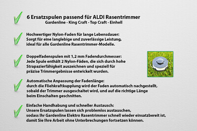 Ersatz Spule, Spulen 5er Pack mit Haube, Deckel, passend für Florabest LUX Trimmerspule T 777 Doppelfaden 1,5 mm kaufen bei OBI 【Breite Passform】Kompatibel mit verschiedenen elektrischen Rasentrimmern, speziell für Modelle wie Gardenline ALDI GLR 450, GLR 451, GLR 452, GLR 453, GLR 454, GLR 455, GLR 456, GLR 457, GLR 458, GLR 459, GLR 450/1, GLR 450/1., 0/2, GL. R 450/3, GLR 450/4, GLR 450/5, GLT 453, GLT 454, GLT 455, GLT 456, für King Craft KCR 450, KCR 451, KCR 500, KCR 500 GB, Top Craft TCR 50, TCR 450, TCR 451, TCR 451, TCR R 500 für Einhell RTV 400, RTV 550, RTV 550/1, Performance Power PWR400DGTA, PWR550GT 【Zuverlässige Leistung】Diese Rasentrimmerspulen wurden entwickelt, um zuverlässige Leistung zu liefern, sodass Sie Ihren Rasen mühelos pflegen und präzise Schnittergebnisse erzielen können. 【Praktisches Paket】Das Paket enthält 3 Schnurspulen, um sicherzustellen, dass Sie eine ausreichende Versorgung für Ihre Trimmbedürfnisse haben. Rasentrimmer-Spule, Ersatz für Ryobi One Plus AC14RL3A, 18 V, 24 V, 40 V, 3,4 m, 2,0 mm, Auto-Feed, 115807843371 Die besten Angebote für 6x Rasentrimmer Spule Ersatz inkl. Spulenabdeckung passend für ALDI Gardenline Elektro Trimmer GLR/GLT 450-459 & GLR 450/1-450/9. - Wir finden günstige Preise und die besten Produkte 【Optimale Größe】 Jede Spule hat einen Durchmesser von 75 mm und eine Höhe von 33 mm, bietet ausreichend Schnurkapazität für effizientes Trimmen. Black Decker Rasentrimmer Laubsauger Fangsack Passend Für ALDI GARDENLINE GLLS 2504 TOP CRAFT Spulen Für Rasentrimmer