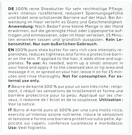 Sie können es auch zur Massage verwenden, um die weichmachende Wirkung mit der aromatischen Wirkung von ätherischen Ölen zu kombinieren. Sheabutter wird als kosmetischer Inhaltsstoff verwendet, aber auch so verwendet, da sie reich an Substanzen ist, die gut für die Haut sind, insbesondere die Vitamine A, B, E und F. Saunaerlebnis – Saunaduftkonzentrat Zitronengras - 50ml Reine Sheabutter dm – Kann man reine Sheabutter im Drogeriemarkt kaufen Sheabutter Bio Für Kosmetik Michael Droste-Laux Entspannungs-Fluid Mit ätherischen Ölen, 50ml Shea Butter Es fördert eine desodorierende und entschlackende Wirkung, wenn es auf die Haut aufgetragen wird. Sie eignet sich hervorragend als aufpolsternde und pflegende Gesichtsmaske oder als feuchtigkeitsspendende Lippenbutter. In dieser Version wurden ätherische Öle hinzugefügt, um ihre kosmetischen Funktionen mit den Eigenschaften der ätherischen Öle zu ergänzen. Wenn es auf die Hände aufgetragen wird, schützt es die Haut vor rauen Klimazonen: niedrigen Temperaturen und starkem Wind. Mit ätherischen Ölen aus Eisenkraut und Zitronengras Kräuterladen Magentina Shea Reine Butter Sheabutter wird als kosmetischer Inhaltsstoff, aber auch pur verwendet, da sie reich an hautfreundlichen Stoffen ist, insbesondere den Vitaminen A, B, E und F. In dieser Version wurden zur Ergänzung ätherische Öle zugesetzt seine kosmetischen Funktionen mit den Eigenschaften ätherischer Öle Kräuterladen Magentina Reine Sheabutter Organischer beruhigender Weichmacher Bio-Sheabutter stellt den reinen Extrakt dar, der aus den Samen der Pflan
