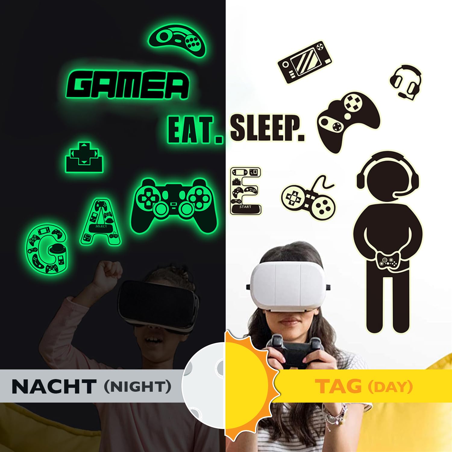 Lichi Gaming Zone Glow in The Dark Wandtattoo, selbstklebend, leuchtend Besonders geeignet für Spielzimmer, Kinderzimmer, Spielzimmer, Wohnzimmer, Gamer-Zonenmöbel, Fenster, Türdekoration. Geeignet für Oberflächen: Diese Gamer-Wandaufkleber sind weit verbreitet auf glatten, ebenen Oberflächen, wie gut geflieste Wände, Glas, lackierte Holzplanken, gut bemalte Wände, aber nicht anwendbar auf rissigen Wänden, unebenen Ziegelwänden, pudrigen Oberflächen, staubigen Oberflächen, ungereinigten Wänden und neu gestrichenen Oberflächen. Bitte erlauben Sie geringfügige Maßunterschiede aufgrund manueller Messung und Rundung. Je länger sie direktem Licht ausgesetzt sind, desto länger leuchten sie im Dunkeln. Fensterbild Frühling Ostern Ostereier Fensterdeko Kinderzimmer Kind Frühlingsdeko Eier... Lichi Wandtattoo, Leuchtet Im Dunkeln, Selbstklebend, Leuchtend Maße: Sie erhalten 1 Bogen Gamer-Aufkleber (30 x 55,9 cm, d., h. Game Sticker ist tagsüber bunt und fluoreszierend im Dunkeln. 【 Eigenschaften der Wandmalerei 】 Dieser Spiel-Themen-Wand-Aufkleber ist einfach abzuziehen und zu kleben, selbstklebend, abnehmbar, wasserdicht, feuchtigkeitsbeständig und harmlos für den menschlichen Körper. Einige Anweisungen für Wandaufkleber: 1., Wählen Sie eine glatte, ebene Oberfläche oder Wand., 2., Reinigen und trocknen Sie die Oberfläche., 3., Selbstklebende Rückseite abziehen und auf die Oberfläche kleben., 4., Drücken Sie, um Luftblasen herauszudrücken. Mit ihnen können Sie lustige Umgebung für Ihr Spielzimmer schaffen. Lichi leuchten im Dunkeln, Spielaufkleber sind unter den meisten Umständen einfach zu verwenden, können leicht eine lustige Spielumgebung in Ihrem Zuhause schaffen. Die selbstklebenden Rückseiten sind so einfach abzuziehen und aufzukleben, dass Sie den gesamten Raum jederzeit verwandeln können, ohne dass Sie einen professionellen Bauunternehmer benötigen. Gleichzeitig sind sie noch ungiftig, antistatisch, wasserdicht und schimmelresistent. Diese hochwertigen leuchtenden Wandbilder sind langlebig und verblassen nicht leicht. Bitte stellen Sie sicher, dass Sie die selbstklebende Rückseite des Aufklebers auf die rechte Oberfläche kleben. Dieser wunderbare Spielzonen-Aufkleber ist eine ausgezeichnete Wahl für Spieler-Schlafzimmer, Jungen- und Mädchen-Spielzimmer, kann leicht energetische Atmosphäre in Ihren Wohnraum bringen
