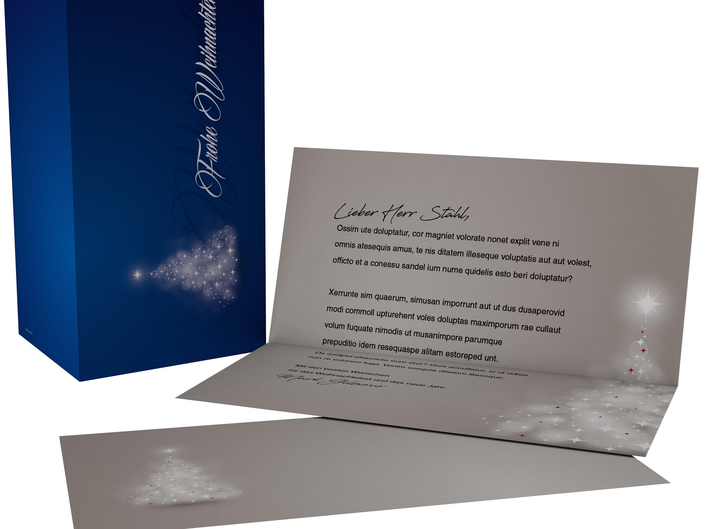 Für eine perfekte Optik Ihrer Weihnachtskarte. Einfachstes Handling durch bedruckbares Einlegeblatt im passenden Design. Die Einleger sind ebenfalls mit dem Motiv bedruckt. Die Karten werden vorgefalzt geliefert, die Einleger kommen plano, um einem Papierstau im Drucker zu vermeiden. Mit dieser Karte verschicken Sie edle Weihnachtsgrüße Die Karten sind außen matt kaschiert. Zum Bedrucken mit Tintenstrahldruckern, Kopierern und Laserdrucker geeignet. Unser Tipp für alle, die die Umschläge nicht direkt bedrucken möchten: Drucken Sie die Adressen auf Klebe-Etiketten und kleben Sie nachträglich auf. Perfekte Weihnachtsakrten im Handumdrehen ohne Farbdrucker. Außen glänzend und innen matt und hochwertige Optik 350g-Karton Die Größe der Karten ist DIN LANG (geklappt 210x105mm, offen 210x210mm) Im Set enthaltene Einleger für alle Laser-, Tintenstrahldrucker und Kopierer geeignet! Direkt vom Hersteller kaufen, MADE in GERMANY Klappkarten mit Goldfolienveredelung | Interiors Inspiration Außenseite matt lackiert, hochwertige Optik. Goldstern auf Grau - Außergewöhnliche Weihnachtskarten für Firmen Besonders schön Klappkarten ohne Verpackung Kuverts in DIN lang. Ein perfektes Ensemble für Ihre Weihnachtsgrüße. Lustige Weihnachtskarten Weihnachtskarten "Verträumter Lichterbaum ROT" | Klappkarten DIN LANG Weihnachtskarte Mit Umschlag Klappkarte im Format DIN LANG, offen 21x21cm. Bei Sets mit Umschlag sind passende, im gleichen Design bedruckt Kuverts enthalten.