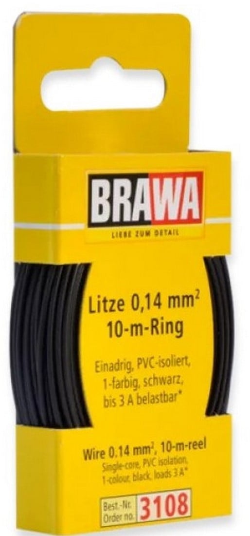 Aderleitung 10mm2 3154 - Litze 0,14 Mm², Braun - Divers - Kabel - Modelleisenbahn Kabel 10mm2 Litze 0,14mm² 10m Ring schwarz , Elektromaterial Aufbau 18 x 0,10 PVC-isoliert max., 3 A belastbar, EAN 4012278031088 , Brawa 3108 Litze 0,14 mm², schwarz 10-m-Ring Einadrig PVC-isoliert 1-farbig Bis 3 A belastbar Cu.-Aufbau 18 x 0,10 Anwendung: Verkabelung analoger Anlagen Brawa 3118 - Litze, 0,14mm², schwarz, 100m Brawa 40107 H0 GÜTERZUGLOK BR 56 DER DRG AC DIG SOUND | De Isenboner Aufbau 18 x 0,10- PVC-isoliert- max.