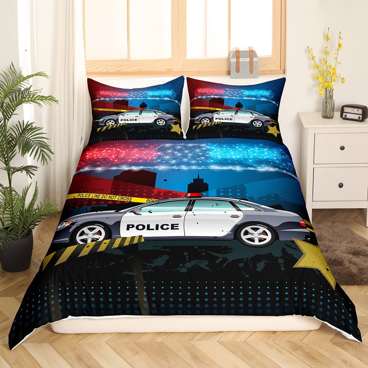 Loussiesd Polizei Bettwäscheset Polizeiauto Blau Rot Lichter Bettwäsche Set 135x200cm 100% Baumwolle Für Kinder Jungen Mädchen Polizei Gangster Bettbezug Set Öffentliche Sicherheit Betten Set