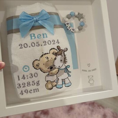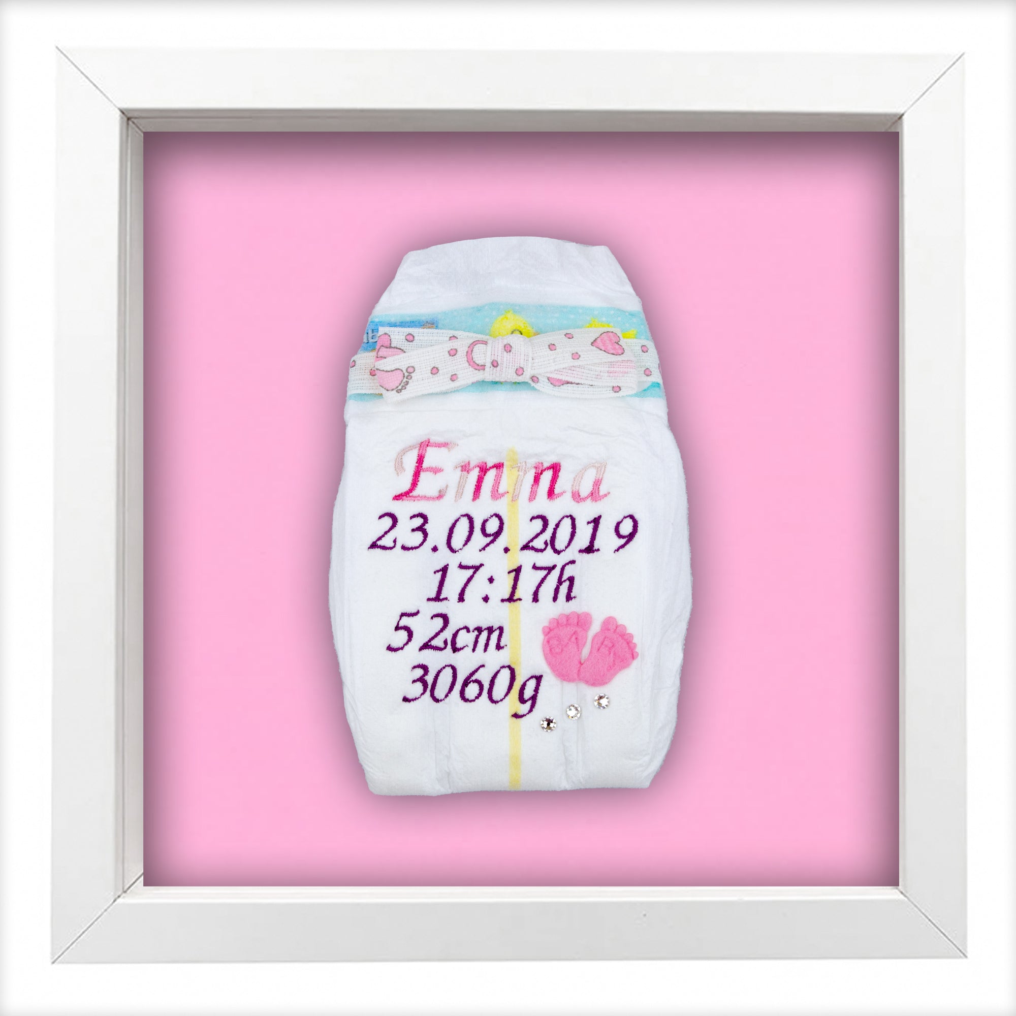 Tanjo Bestickte Windel Im Rahmen Weiß, Mädchen, Süßes Geschenk Zur Geburt I Taufgeschenk, Mit Kristallen Verziert | Name, Datum, Uhrzeit, Gewicht Und Größe | Nachhaltiges Babygeschenk