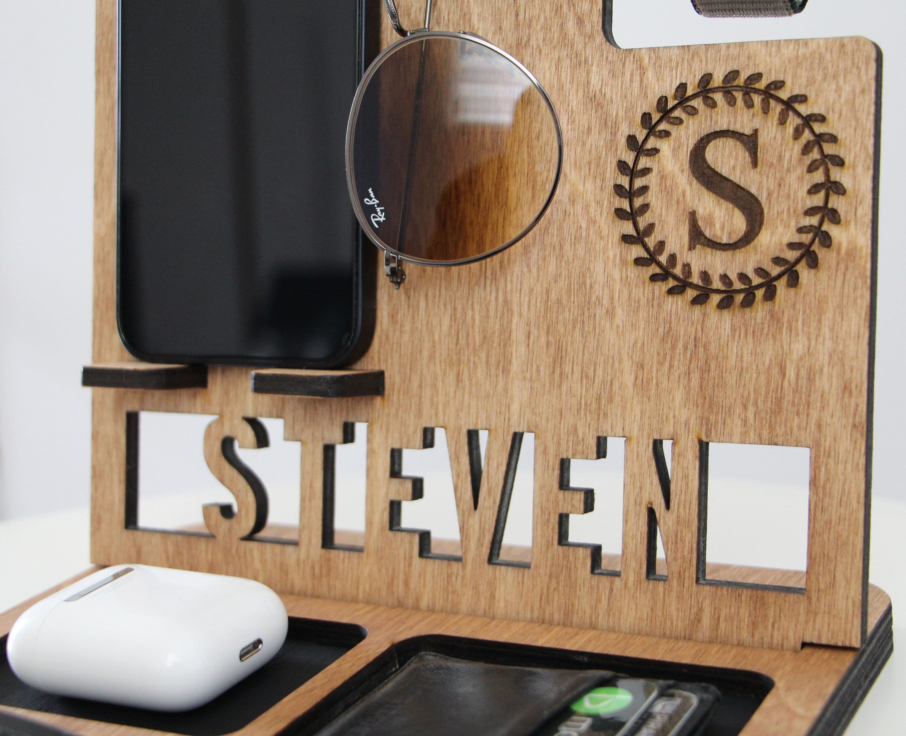 Klicken Sie auf die Schaltfläche Jetzt anpassen auf der rechten Seite, um Ihren einzigartigen Schreibtisch-Organizer anzupassen., ★ Jetzt anpassen ★ Beschreibung: Personalisierte Handy-Dockingstation aus Holz. Der Ständer hat auch Fächer für Brieftaschen, Dokumente, Brillen, Uhren, Fitnesstracker, Armbänder, Schlüssel, Schreibwaren usw. Multifunktionale Ladestation und Organizer: Ein exklusives Haus für Ihre persönlichen Gegenstände, wie Handy-Ladestation, Schlüsselhalter, Brieftaschenständer, Uhren-Organizer und Brillenstation Refined Living Organizer Holz Telefon Dockingstation Geschenke für Männer & Frauen Geburtstag (Schreibtisch Nachttisch Organizer ladestation holz Büro Aufbewahrung, 1 St., Vatertagsgeschenk für Papa für Mama, Geschenke zum Valentinstag), Geschenke für Die beiden Teile können auch separat als 2 Einzelartikel verwendet werden, Einfache Installation Der Ständer ist einfach zu montieren (mit Anleitung). Größe zusammengebaut 25 x 18,8 x 20 cm, Ideale Geschenkidee Überraschen Sie Ihren Ehemann, Vater, Sohn, Freund, Bruder, Freund, Kollegen oder Chef. Die Dockingstation ist eine perfekte Ergänzung für jeden Raum oder Arbeitsplatz. Das Oberteil kann zusammen mit dem Schubladenboden magnetisch befestigt werden. Mit seinem geräumigen Design ist es ideal für Brieftaschen, Brillen, Uhren, Handys, Schlüssel und mehr. Stark und stabil – Diese Holz-Dockingstation besteht aus 100 % hochwertigem Bambus. ★ Es ist das beste Geschenk für Ehemann, Vater, Großvater, Freund, Bruder, Sohn, Freund, Kollege, Chef oder sich selbst. Die Oberfläche ist glatt poliert und mit einer langlebigen Oberfläche überzogen, bietet eine angenehme Haptik, was es zu einem besten Schreibtischzubehör für Männer macht. Verbessern Sie Ihr Organisationsspiel mit unserem Premium-Organizer aus Holz, in dem Qualität auf Stil trifft. Halten Sie Ihren Raum aufgeräumt und verfeinert mit dieser eleganten Ergänzung für Ihr Zuhause oder Ihren Arbeitsplatz Ladestation und Organizer: Zusätzlich zum Aufladen hält unser Telefonständer Schreibtisch-Organizer die täglichen Utensilien organisiert und griffbereit. Passt perfekt in jedes Interieur - sowohl im klassischen als auch im modernen Stil. provozieren Korruption Schatten geschenk herren Iunität werfen Verabschieden Sie sich von unordentlichen Schreibtischen. ★ Anpassbar: Wir haben einen hochwertigen Lasergravurprozess, Sie können es mit Initiale und Namen personalisieren.