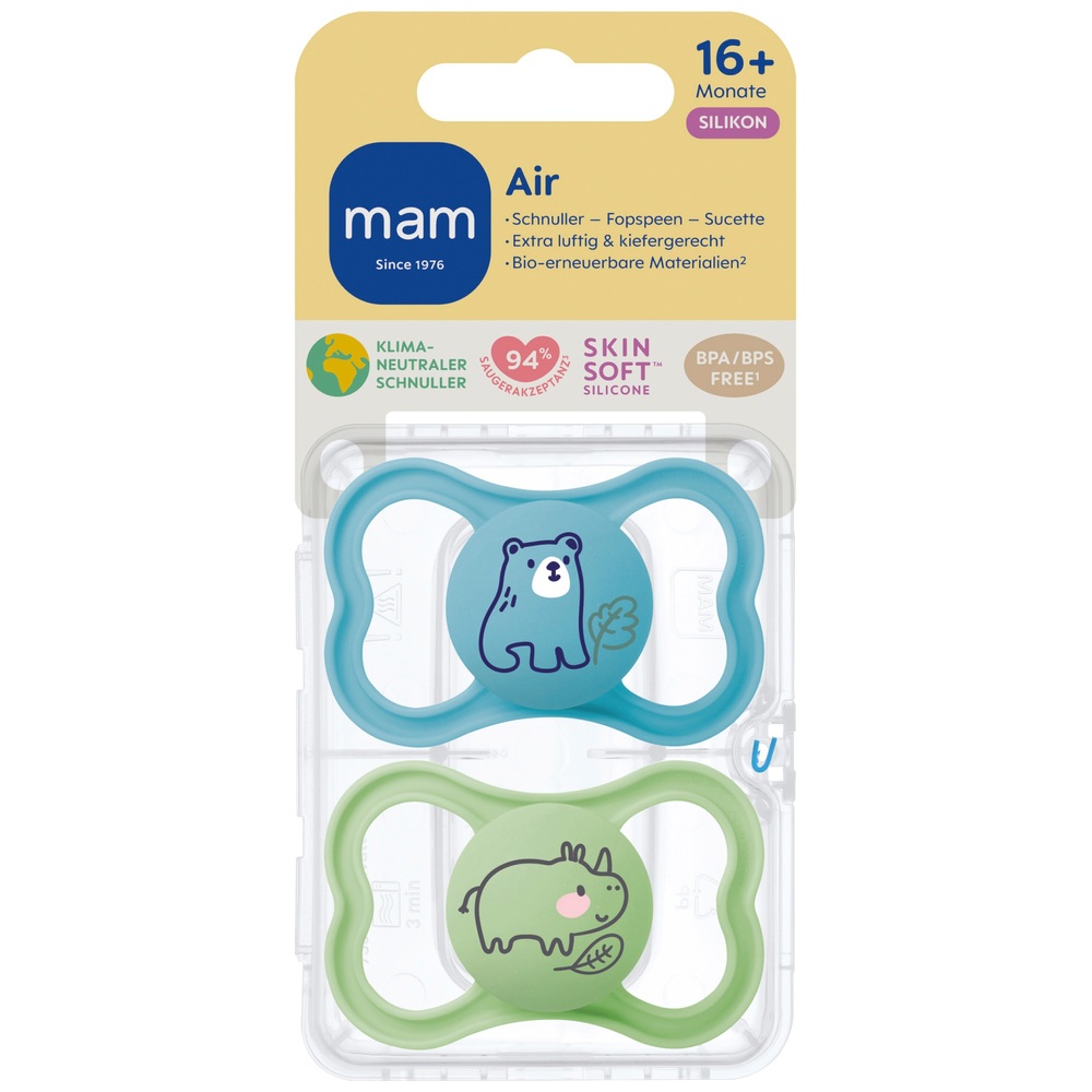Einfache Sterilisation - Neben dem einfachen Transport dient die Schnullertasche auch als Sterilisationsbox, um den Schnuller in der Mikrowelle in nur 3 Minuten und bis zu 48 Stunden zu desinfizieren Das Geheimnis einer ruhigen Nachtruhe? Unser MAM Original Night Schnuller, ausgestattet mit einem praktischen Knopf, der im Dunkeln leuchtet, so dass Eltern ihn auch nachts leicht finden können. Darüber hinaus hat die kleine und leichte Augenmaske eine gebogene Form für maximalen Komfort. MAM Night Schnuller 2er-Pack Silikon 6-16 Monate, 6,95 MAM Schnuller Original Silikon, grün/beige, 16+ Monate, 2 St dauerhaft günstig online kaufen * Marktforschung 2010- 2023, getestet mit 1., 588 Kindern ** Maske, Knopf und Sterilisationsverpackung werden aus Polypropylen hergestellt, das mit bio-kreisförmigen Rohstoffen gemäß dem von ISCC PLUS zertifizierten Massenbilanzansatz verbunden ist. Kiefergerechtes Design – Der MAM Schnuller 16 36 Monate wurde in Zusammenarbeit mit Zahnärzten entwickelt und sein flacher, symmetrischer Sauger passt sich dem Mund des Babys an - für eine gesunde Zahnentwicklung Der Schnuller Original ist mit einem flachen, symmetrischen Sauger hergestellt, der sich an den Mund des Babys anpasst, um die Auswirkungen auf die Mundentwicklung zu reduzieren und gleichzeitig seinem natürlichen Saugbedürfnis gerecht zu werden. Maske, Knopf & sterilisierende Verpackung Produkte aus bio-kreisförmigen Materialien** , BPA- und BPS-frei., Farbe: hellblau/blau Leichte und hautfreundliche Maske Bereits ab 6,26 € ✓ Große Shopvielfalt ✓ Testberichte & Meinungen ✓ | Jetzt MAM Original Schnuller Silikon 16-36 Monate günstig kaufen bei Von 94%* der Babys akzeptiert - Der MAM SkinSoft Silikon Sauger des Schnullers 16 36 Monate simuliert die Mutternippel, für einen einfachen Übergang vom Stillen zur Brust und zum Schnuller MAM Schnuller 16+ Monate - Entworfen in Zusammenarbeit mit medizinischen Experten, leuchtet im Dunkeln! Dieses Schnuller Set besteht aus superweichem SkinSoft Silikon, das ein angenehmes natürliches Gefühl vermittelt und von 94%* der Babys akzeptiert wird, und ist mit einem Knopf ausgestattet, der auch von kleinsten Händen leicht zu greifen ist. Mam Sauger 3 MAM Supreme Night Schnuller Im 2er-Set, Leuchtender Babyschnuller Für Eine Gesunde Zahn- Und Kieferentwicklung, Beugt Hautreizungen Vor, Mit Schnullerbox, 16+ Monate, Löwe/Zebra Mam Sauger 2 LIEFERUMFANG - MAM ORIGINAL Night-Set für Neugeborene mit 2 Schnullern, MAM Schnuller 16+ Monate, kiefergerecht, Silikon, Baby Schnuller Kit und Sterilisator tragbar, hellblau/blau