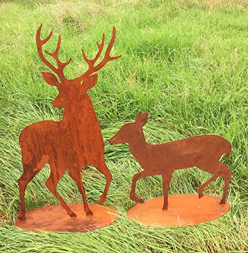 2er Set Fressendes REH MIT REHKITZ Kitz Hirsche Rehe äsend Rost Edelrost Metall Tier + Original Pflegeanleitung Von Steinfigurenwelt