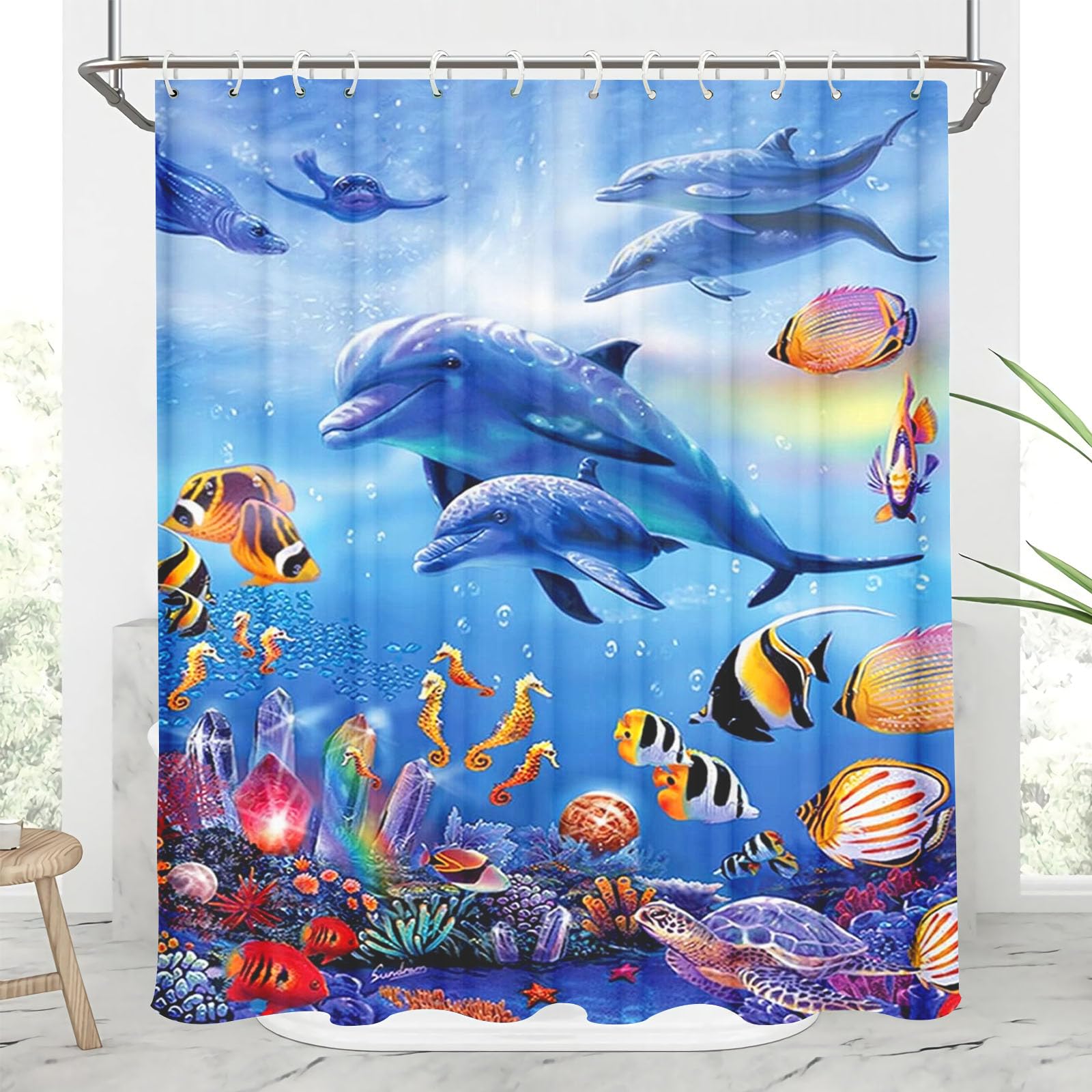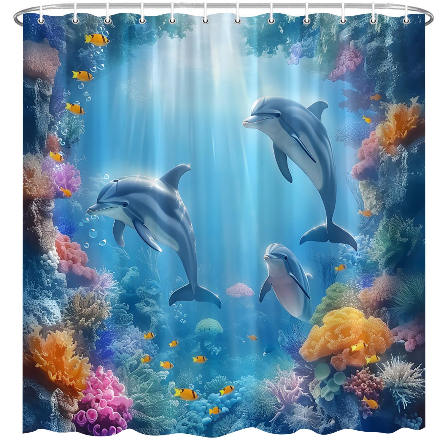Delfin-Duschvorhang, Blauer Ozean, Tier, Tropische Fische, Koralle, Unterwasserriffe, Meeresboden, Meeresgrund, Meereslicht, Dringt In Das Meer Und Den Strand Ein, Polyestergewebe