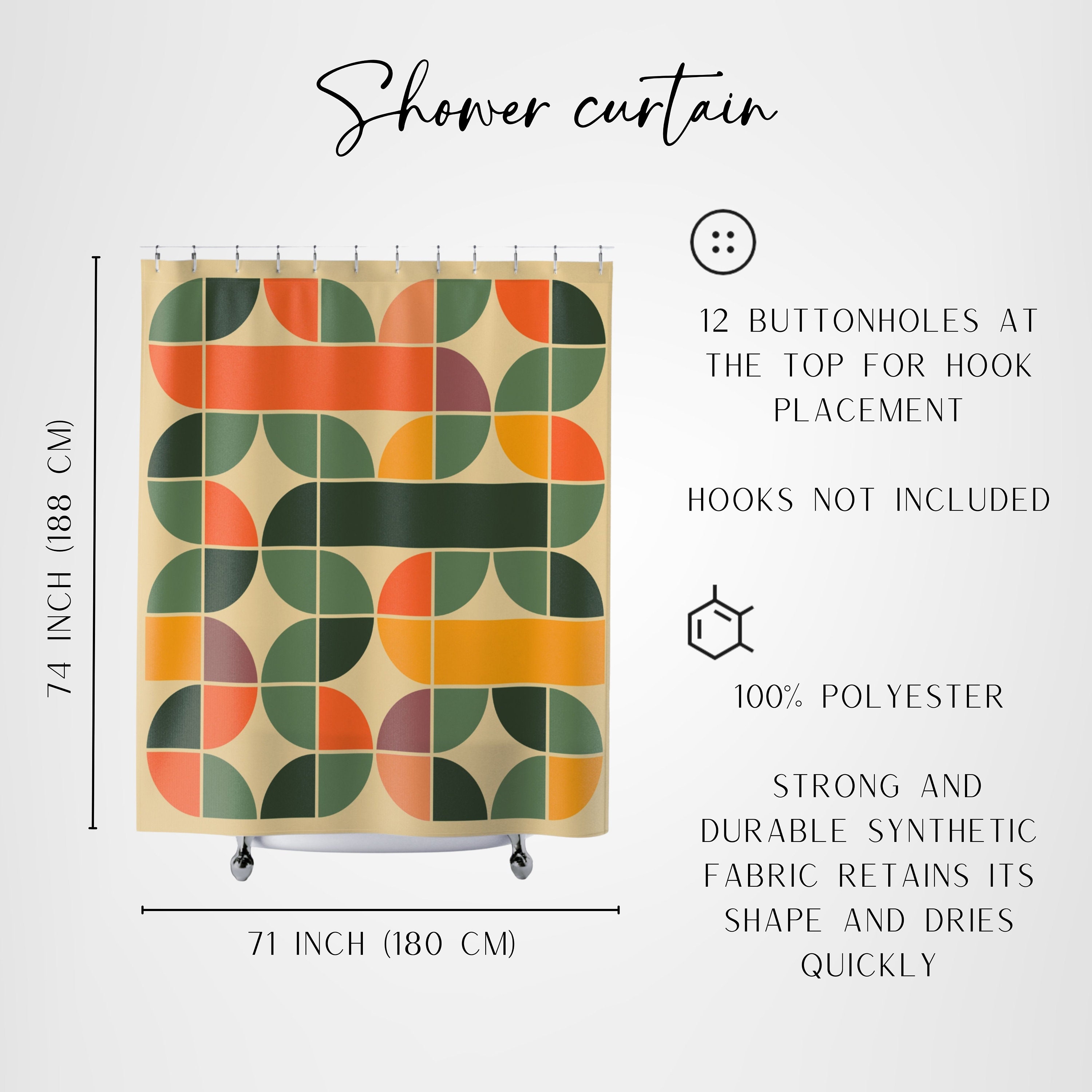 ABSTRAKTISCHER DUSCHVORHANG – Gestalten Sie Ihr Traumbadezimmer mit einem unserer bunt gestreiften Duschvorhänge im Stil moderner Kunst. Dank des gewellten Designs, das minimalistische und Retro-Ästhetik vereint, können Sie Ihrem Badezimmer innerhalb eines Tages einen einzigartigen Akzent verleihen Und hält Ihr Badezimmer trocken und sauber. Er passt auf viele Duschwannen in Standardgröße und funktioniert mit geraden oder gebogenen Duschstangen. Einfach aufzuhängen: Die 183,9 x 183,9 cm großen Duschvorhänge enthalten 12 Kunststoff-Vorhanghaken und 12 Metallösen, einfach zu installieren und zu schieben. Bitte haben Sie Verständnis dafür, dass der Duschvorhang den Boden weglässt, um eine bessere Hygiene zu gewährleisten. Ttincceer 183x198cm Mid-Century Duschvorhang Orange Sun Line Regenbogen Abstrakt Bad Vorhang Tropische Palme Aquarell Blatt Duschvorhänge Badewanne Vorhang Entdecke unsere Auswahl an Retro- & Vintage-Duschvorhängen, die deinem Badezimmer einen Hauch von Nostalgie verleihen. Stilvolle Muster und klassische Designs warten darauf, deine Dusche in eine Zeitreise zu verwandeln Einzigartiges Design: Der Badezimmervorhang wird mit fortschrittlicher Technologie bedruckt, um sicherzustellen, dass die Farben lebendig und naturgetreu bleiben, was ihn zu einer tollen Ergänzung für Ihr Badezimmer macht. Unsere gewichteten Duschvorhänge werden mit 12 Metallösen an der Oberseite zum einfachen Aufhängen geliefert., Maschinenwaschbar und trocknergeeignet. Er kann nicht nur als Badezimmer-Duschvorhang verwendet werden, sondern auch als Türvorhang, Küchenvorhang, Fenstervorhang, Wandkunst-Dekor, Wandteppich, Fotohintergrund und Trennvorhang verwendet werden. Funktional: Während der Dusche kann es effektiv verhindern, dass Wasser spritzt, während Sie duschen. Premium-Qualität: Die Retro-Regenbogen-Duschvorhänge sind aus weichem Polyestergewebe, robust und wasserabweisend, schnell trocknend, gut verarbeitet und für eine lange Zeit verwendet. Größe: 182,9 cm Breite x 182,9 cm Höhe, passend für die meisten Duschkabinen/Badewannen in Standardgröße. Ob Sie eine gerade oder gebogene Duschstange haben! Die Duschvorhänge verleihen Ihrem Badezimmer eine bunte Note und sind auch eine schöne Ergänzung für die Außendusche. Material: weiches Polyestergewebe, robust, gut verarbeitet, funktioniert hervorragend. 3D Holz-Wandpaneele Regenbogen - geometrisch (3-teilig) - MDF Natur Setzen Sie mit klar definierten Formen und Linien tolle Akzente an der Wand!
