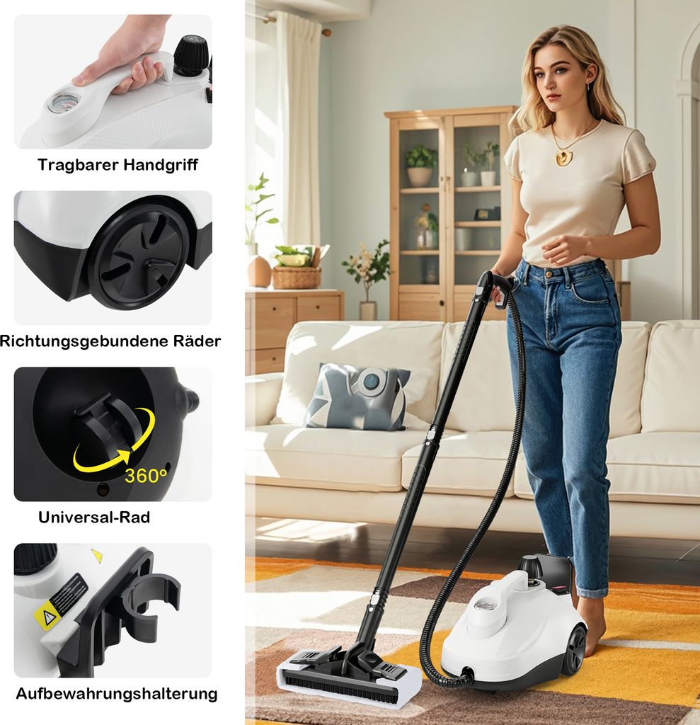 HAUSHOF Dampfreiniger 1800 W, Mit 1,5 L Tank, Max. 4 ,0 Bar Dampfdruck, Aufheizzeit 8 Min, Dampfzeit Bis Zu 30 Min, Inkl. 17 Zubehör & 3 M Netzkabel, Für Boden, Teppich, Fenster