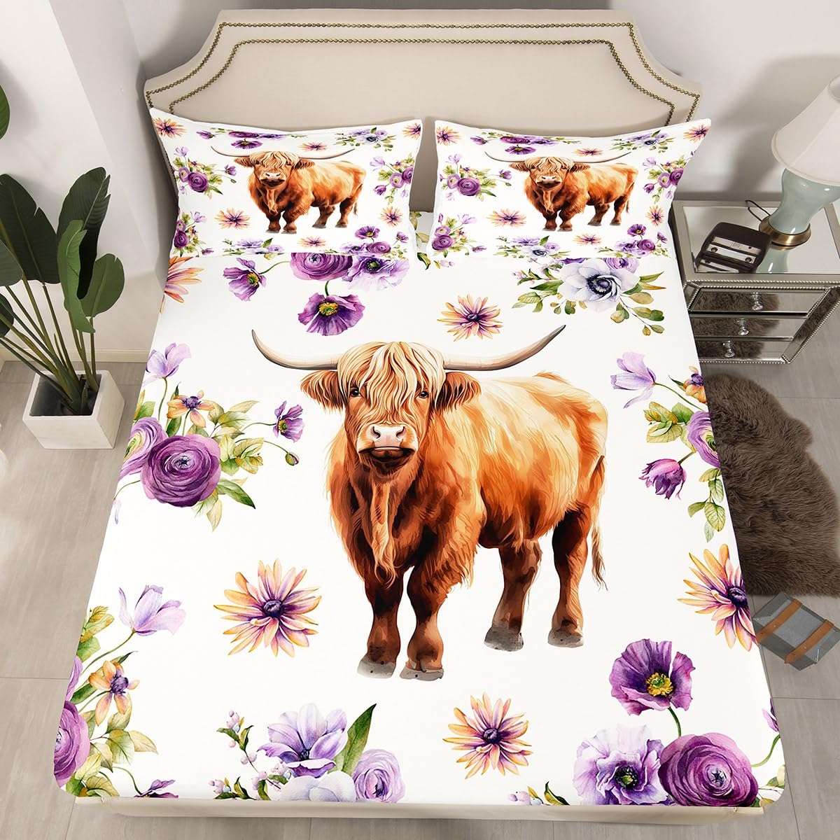 Castle Fairy Highland Cow Spannbettlaken-Set Mit 2 Kissenbezügen, Rustikaler Bauernhaus-Stil, Tier-Bettlaken Für Jungen Und Mädchen, Violette Blumen, Landhaus-Rosa, Oberlaken, Luxuriöse Mikrofaser