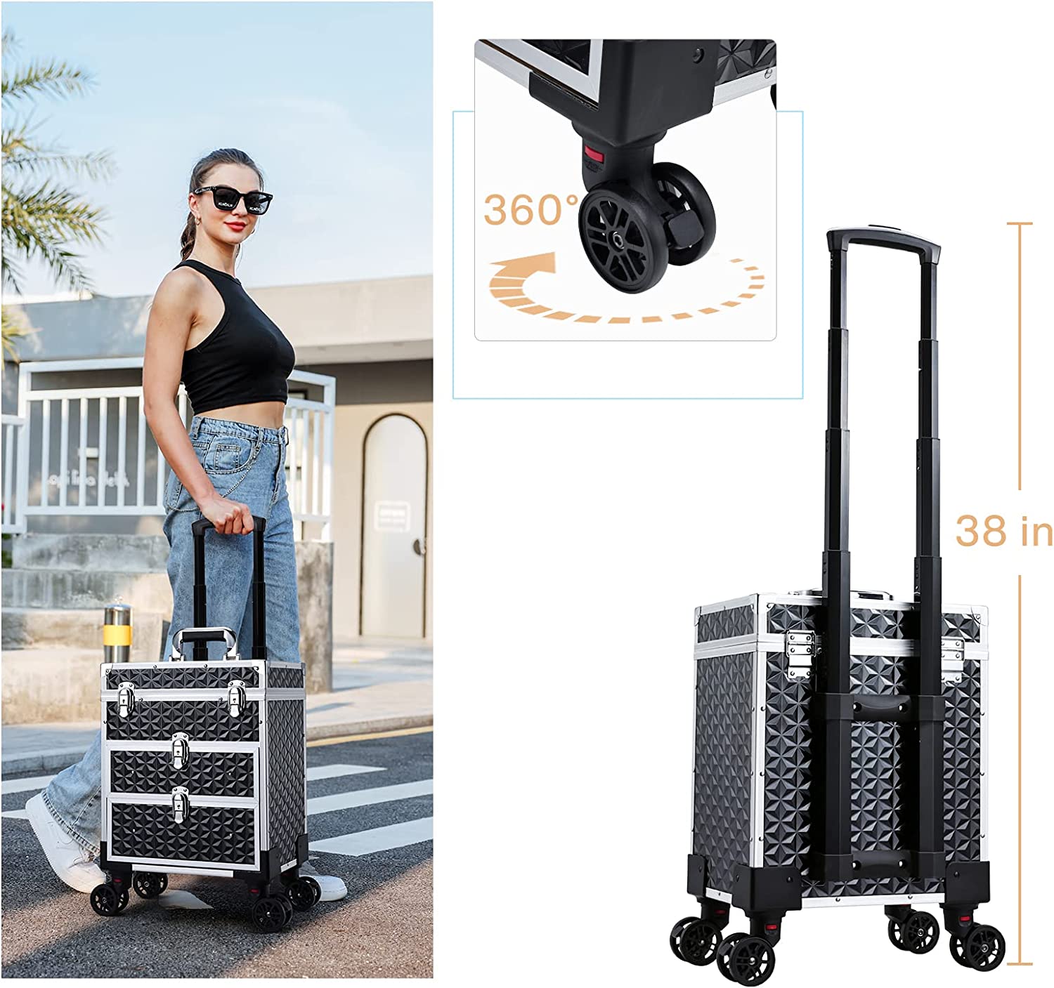 Sie können alle Ihre Haar- und Schönheitswerkzeuge sicher darin aufbewahren. 【Hochwertige Materialien】Herstellung aus hochwertigem Manganstahl, Metall und PU. GDAE10 Kosmetikkoffer Trolley mit Armlehnenstänr, Tattoo-Koffer mit 3 Schublan, Professioneller Schminkkoffer, Tattoo-Tisch, Kosmetikstänr, Tattoo-Ausrüstung, Nagelkoffer für Frauen mit Rärn Bitte stellen Sie vor dem Kauf sicher, dass Sie nichts dagegen haben., 6., bitte erlauben Sie den leichten Farbunterschied durch das Schießen Licht und 1-3cm Fehler aufgrund der manuellen Messung verursacht und machen sur Die Metallplatte auf dem Deckel ermöglicht es Ihnen, Arbeitsmaterialien in Griffweite zu platzieren. Versuchen Sie bitte, im täglichen Gebrauch übermäßige Stöße und Stürze zu vermeiden, um die Lebensdauer des Produkts zu verlängern., 3., bitte reinigen Sie die Räder rechtzeitig, um eine reibungslose Bewegung zu gewährleisten. Spezifikationen Material: Manganstahl, PU, Acryl/Metall Farbe: Schwarz Stil: Modern Form: Rechteckig Montage erforderlich: Ja Montageart: Bodenaufstellung Radart: Universalrad (mit zwei Bremsen) Tragemethode: Hand-gehalten, Hand-gezogen Tragfähigkeit: 20kg /44., 09lbs Anzahl der Seitenschubladen: 3 Zugstange Verstellbare Höhe: 13-38cm/5., 12-14., 96in Gesamtproduktgröße: 42x28x53cm/16., 54x11x20., 87in Paketgröße: 72x48x33cm/28., 35x18., 9x12., 99in Bruttogewicht: 14., 2kg/31., 31lbs Nettogewicht: 13kg/28., 66lbs Lieferumfang 1xRollbarer Schminkkoffer 1xMehrsprachige Anleitung Hinweise 1., bitte beachten Sie, dass die Kosmetika nicht enthalten sind. Das Produkt ist korrosionsfest, verschleißfest und nicht leicht verblichen, um eine lange Lebensdauer zu gewährleisten. Flexible Bewegung]Leichte, stumme Allzweckräder (2 mit Bremsen), ein 2-Gang Teleskop-Zugstab und ein Griff am Koffer ermöglichen es Ihnen, den Koffer problemlos die Treppe hoch und runter, in und aus dem Auto und im Aufzug zu bewegen TAIDU Koffer Tattoo mit drei Schublan Gepäckkoffer Verbund PU ABS Reisetasche Großer Stauraum Tattoo-Ausrüstung 【Flexible Bewegung】Leichte, stumme Allzweckräder (2 mit Bremsen), ein 2-Gang Teleskop-Zugstab und ein Griff am Koffer ermöglichen es Ihnen, den Koffer problemlos die Treppe hoch und runter, in und aus dem Auto und im Aufzug zu bewegen. Tattoo Koffer Mobil Mit Tisch HOINCO Tattoo Koffer,Tattoo Armlehnenständer Mit 3 Schubladen Verstellbarer Tattoo Tisch Beauty Stand Tattoo Ausrüstung Maniküre Nageltisch Bitte vermeiden Sie langfristige Sonneneinstrahlung., 4., Um ein Umkippen des Koffers zu vermeiden, stellen Sie bitte sicher, dass die Vorderräder nach vorne zeigen und eingerastet sind, wenn Sie ihn aufstellen und benutzen., 5., Es ist normal, dass die Spurstange ein wenig wackelt, da sie Spiel braucht, um sich besser hin und her bewegen zu können. Alle modischen Inspirationen & die neuesten Trends finden Sie online bei SHEIN Bitte halten Sie sich von ätzenden Flüssigkeiten fern.