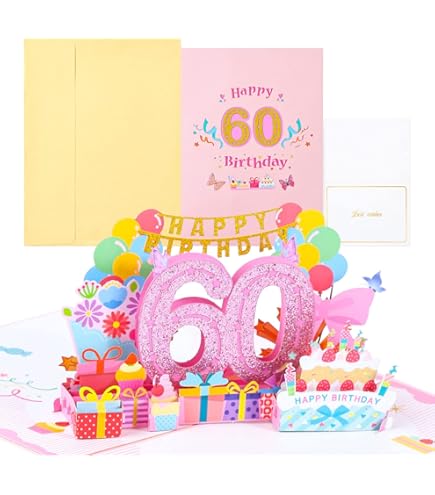 TOG BEG® 3D Pop-up Grußkarte Mit Nummer 60 Und Dekolationen Wie Luftballon, Geschenke Und Ein Grammophon Zum 60. Geburtstag Junge Oder Jubiläum, Hochzeit Inkl. Umschlag - Pop Up Karte Geburtstag 60
