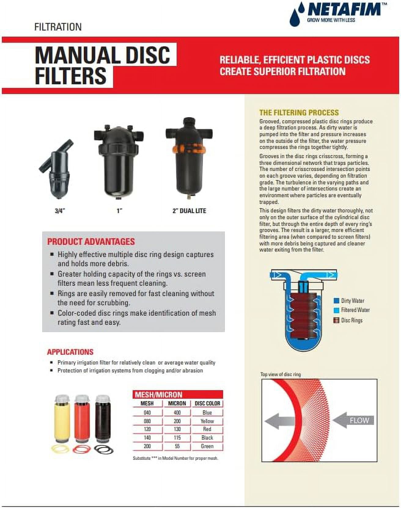 Die Turbulenzen in den unterschiedlichen Wegen und die große Anzahl von Kreuzungen schaffen eine Umgebung, in der Partikel schließlich eingeschlossen werden. - Rillen in den Scheibenringen kreuzen sich und bilden ein dreidimensionales Netzwerk, das Partikel einfängt. - Gerillte, komprimierte Kunststoffscheibenringe erzeugen einen tiefen Filtrationsprozess. Die Anzahl der überkreuzten Kreuzungspunkte auf jeder Rille variiert je nach Filtrationsgrad. Während der Filtration werden die Ringe zusammengedrückt, wodurch das Wasser effektiv gefiltert wird und das System vor Verstopfung geschützt wird. Das Ergebnis ist ein größerer, effizienterer Filterbereich (im Vergleich zu Siebfiltern), in dem mehr Schmutz aufgefangen wird und saubereres Wasser aus dem Filter austritt. - Kunststoffringe stapeln sich zusammen und bilden ein zylindrisches Filterelement. Netafim Kompressionseinheit Vorfilter Beregnung Mit Scheibenfilter 1" - Mesh 120, 8,12 Netafim Filterelemente Das Ergebnis ist ein größerer, effizienterer Filterbereich (im Vergleich zu Siebfiltern), in dem mehr Schmutz aufgefangen wird und saubereres Wasser aus dem Filter austritt. Der Netafim DF075-120 1,9 cm Scheibenfilter ist für Gärtner... Da Schmutzwasser in den Filter gepumpt wird und der Druck an der Außenseite des Filters zunimmt, komprimiert der Wasserdruck die Ringe dicht zusammen. Der Netafim DF075-120 1,9 cm Scheibenfilter ist für Gärtner und Bewässerungsbegeisterte konzipiert, die eine zuverlässige Filtration in ihrem Tropfbewässerungssystem suchen Leicht zu reinigen: Ringe lassen sich für eine schnelle Reinigung leicht entfernen, ohne dass ein Schrubben erforderlich ist. Sieb Bewässerungsfilter, 120 Mesh, 130 Mikron Level Scheibenfilter Tropfbewässerung Gartenbewässerungssystem Landwirtschaft