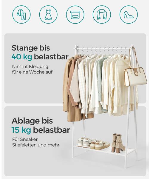 Coat Hanger Stand KOMFOTTEU Garderobenständer 184cm Kleiderständer Mit Schirmständer, Jackenständer Mit 12 Kleiderhaken Kleiderständer Stabil EUGAD Klederständer, (1 St), mt Stzbank, 3 n 1 Desgn, 100x175x40 Die untere Ablage bietet zusätzlichen Stauraum für Schuhe und Accessoires, eine einfache Lösung für zusätzliche Aufbewahrung von Kleidungsstücken Schafft zusätzlichen Platz zum Aufhängen in jedem Raum Der SunnyPoint Kleiderständer aus Metall ist der perfekte offene Schrankständer, um Ihre täglichen Outfits oder saisonale Kleidung zu organisieren. Einfache Montage mit beiliegendem Werkzeug Er besteht aus einem hochwertigen Metallrahmen mit einer strukturierten Pulverbeschichtung, die zu den meisten Einrichtungsstilen passt. Platzsparendes Modell mit Kleiderhaken, Schublade und Schuhablage. Im Schlafzimmer und Ankleideraum sind Sie mit einem Garderobenständer in der Lage, Ihr Outfit für den nächsten Tag zusammenzustellen, um es morgens schnell anzuziehen relaxdays Klederständer Klederständer mt Ablage SANDRA, Weß Verfügbarkeit & Alternativen im Preisvergleich ✓ Jetzt Wäschezubehör Alternativen zu Relaxdays Kleiderständer mit Ablagen (10027467_55) günstig auf kaufen! Robuste, robuste Ganzmetall-Konstruktion mit feststellbaren Rädern