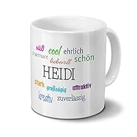 Füllvolumen der Kaffeetasse ist 325 ml So beginnt der Morgen gleich mit einem Lächeln. Brillant glänzender Aufdruck, spülmaschinenfest Originales Design von printplanet, Füllvolumen der Kaffeetasse ist 325 ml, Anderer Namenswunsch? Einfach in der Suche printplanet Schwarze Tasse + Wunschname eingeben HEIDI Heidi, Heiiiidi, Deine Welt sind die Berge? - jeder erinnert sich gerne an die Zeichentrickserie mit Heidi, Peter und dem Alm-Öhi. Bringen Sie mit unseren Partybechern die Berge und die idyllische Natur zu sich nach Hause Einfach in der Suche: digital print Tasse + Wunschname eingeben. Personalisierte Tasse mit Namen Heidi , Maße: Höhe: ca., 9,5 cm; Durchmesser: 8 cm Die Tasse mit persönlichem Namen ist für die Spülmaschine geeignet und besteht aus kratzfestem Material. Es stehen auch weitere Tassen-Designs mit einer Vielzahl von Vornamen zur Auswahl. Becher und Druck in höchster Qualität. Kaffeetasse Xxl Printplanet Tasse Mit #kaffeejunkie - Motiv Hashtag - Kreative-Tasse Kaffeebecher Xxl Originales Design von digitalprint Ein ganz besonderer Kaffee/Tee-Genuss für zu Hause oder das Büro. Material: hochwertiges Steingut (weiß lasiert), Füllvolumen: 325 ml, Höhe: ca., 9,5 cm, Durchmesser: 8 cm printplanet Tasse mit Namen Heidi - Motiv Engel überall - Namenstasse, Kaffeebecher, Mug, Becher, Kaffeetasse - Farbe Weiß Namenstasse Marina - Löffel-Tasse mit Namens-Motiv Chrom-Schriftzug