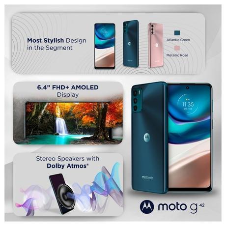 Schnellladung dank 20W Turbo Power Ladegerät Simlockfreie Handys Motorola Moto G42 Im Test: 1,7 Gut Motorola G57 50 MP Dreifach-Kamera – Nehmen Sie scharfe Fotos auf, sowohl Nahaufnahmen als auch aus der Ferne in jedem Licht. Das Motorola Moto G42 macht sich unmöglich, zumindest aus Sicht seiner Mittelklasse-Rivalen. Mit seinem hellen OLED-Panel, einem 5000-mAh-Akku und einer 50-MP-Kamera bietet das 6,4-Zoll-Smartphone sehr viel Ausstattung, ist aber schon für knapp 200 Euro zu haben 5000 mAh Akku - Mit dem geräumigen 5000 mAh Akku können Sie Ihr Telefon bis zu zwei Tage verwenden, ohne sich Gedanken über das Aufladen machen zu müssen. Qualcomm Snapdragon 680 Prozessor - Holen Sie sich die Geschwindigkeit, die Sie brauchen, mit dem Qualcomm Snapdragon 680 Prozessor, der schnell auf jede Berührung reagiert. Entdecke das vollständig erneuerte Motorola Moto G42 ohne Vertrag und mit Garantie bis zu 40% günstiger 100% nachhaltiger Spielen, Streamen und Chatten mit Freunden ohne Unterbrechung. Motorola Moto G42 Dual SIM 64GB, 4GB RAM, Atlantic Green, XT2233-1 - Display: 6,43 Zoll (16,33 cm) Hauptkamera: 50 + 8 + 2 MP Speicher: 64 GB / 4 GB RAM Akku: 5000 mAh