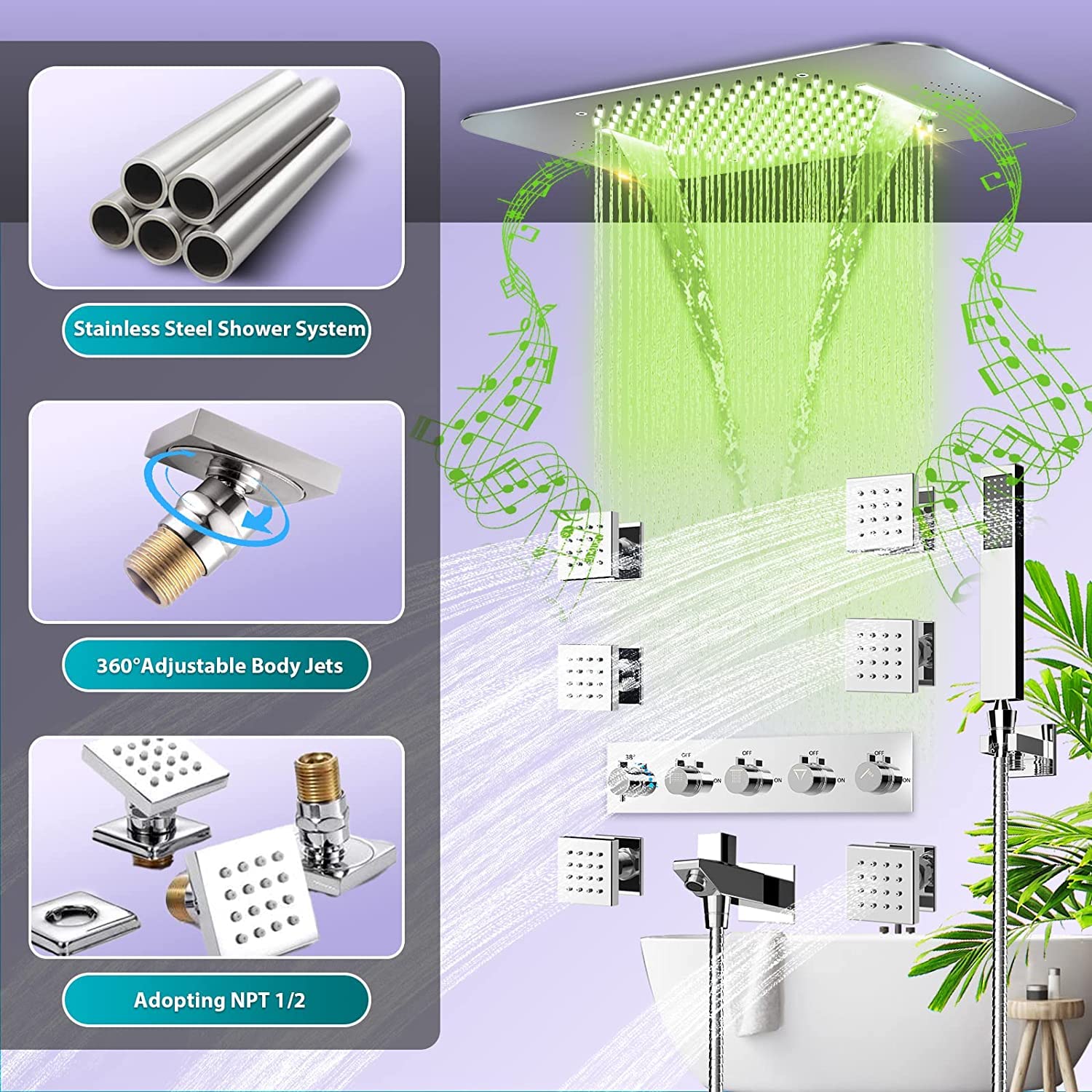 ❤ Hochwertiges Material: Duschkopf und der Schlauch befinden sich in hoher Qualität von 304 Edelstahl. 64 Arten von Lichtfarben können über die mobile App gesteuert werden. 64 Lichtfarben können von der mobilen Anwendung gesteuert werden LED DUSCHSET DUSCHPANEEL Duschsäule Edelstahl Wasserfall Regendusche... Dieses multifunktionale Duschsystem passt sich unterschiedlichen Bedürfnissen an. Beinhaltet ein gebaues Fall, die Wartung erfordert nicht sicherer und praktischerer Wand , ❤ Produktdetails: 1., Wassersparung taps: Süßwasser, Reduzieren Sie den Lärm, vermeiden Sie Spritzer und sparen Sie Wasser., 2., 6 PCs Massagedüse: Genießen Sie eine Dusche über den ganzen Körper, Sie können aus allen Winkeln duschen und einen belebenden Jet für den Körper genießen., 3., Silikondüsen: Die selbstverzählten Silikondüsen verbinden sich, duschen Sie zur einfachen Reinigung und verhindern Siestein. Es handelt sich nicht nur um Niederschläge, ein Wasserausgangs -Designstil mit Kaskadenfunktion, auch 2 Lautsprecher, kann die Bluetooth Ihres Telefons verwenden, um die Bluetooth der Dusche zu verbinden und Ihre Lieblingsmusik zu spielen. Regendusche Mit Armatur LNXGJJ Duschkopf Musik Brausekopf Dusche Chrom Regendusche 64 Farben LED Duschkopf Unterputz Brausekopf Edelstahl 900 * 300 Mm Sparduschkopf Regendusche Duschkopf ❤ LED Music Duschkopf: Duschkopf mit 58*38 cm Decke. LED DUSCHSET DUSCHPANEEL Duschsäule Edelstahl Wasserfall Regendusche Die ideale Dusche weckt Ihre Sinne und macht Sie erfrischt und bereit für den kommenden Tag. Der Duschkontroller, die Handdusche, der Sprühstrahl, der Schnabel und die Duschunterstützung sind in Messing, was die Lebensdauer des Produkts garantiert. ❤ Multi-Funional Duschsystem: Wasserauslass mit 4 Funktionen: Regeneffekt Duschkopf, Handdusche, Badewanne, Körperdüsen. Doppelknopf, um kaltes und heißes Wasser separat zu steuern. Die Duschkartoffeln haben einen LED -Streifen und genießen das Vergnügen, Änderungen zu beleuchten. Dieses Multifunktions-Duschsystem passt sich an verschiedene Anforderungen an. Wenn Sie Fragen zum Produkt haben, zögern Sie nicht, uns in Verbindung zu setzen, wir dienen Ihnen gerne gerne