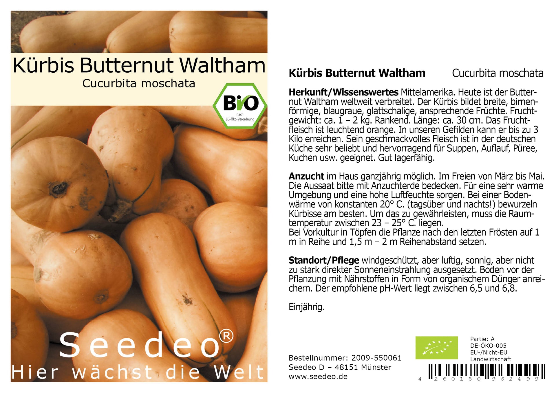 Sein Fleisch ist in der deutschen Küche sehr beliebt und hervorragend für Suppen, Auflauf, Püree, Kuchen usw.geeignet.Gut lagerfähig. Im Freien von März bis Mai. ReinSaat Kürbis "Muscade de Provence", 1 Packung - Bloomling Österreich Kürbis Samen Preis: €1.65 - Muskatkürbis Moschata De Provence Kürbis Pflanzen Saatgut aus biologischem Anbau., DE-ÖKO-005 , 10 Samen Die Aussaat bitte mit Anzuchterde bedecken. Boden vor der Pflanzung mit Nährstoffen in Form von organischem Dünger anreichern. Produktinformationen Kürbis Muscade de Provence BIO ArtNr.: 1BG265 Klassiker, deutlich gerippt, von Grün nach Braun verfärbend, sehr massives und gutes Fruchtfleisch, 5- 12 kg moschata Reifezeit: 125 Tage Rankverhalten üppig Cucurbita moschata überzeugen zumeist durch den hohen Carotingehalt. 1 Portion = 10 Korn Standort / Licht: Der Aussaatstandort sollte hell und sonnig sein und konstant feucht gehalten werden, aber nicht nass. Sie benötigen eine Keimtemperatur von etwa 16 - 22°C, bei Vorkultur in Töpfen nach den letzten Frösten auf 1 m in Reihe und 1,5 m bis 2 m Reihenabstand. Herkunft: Der Muscade de Provence stammt ursprünglich aus Japan. Kürbis-Saatgut (Bio) - raimund Er verfärbt sich bei der Reife von dunkelgrün in terracotta mit grauem Überzug. Das dicke Fruchtfleisch ist tieforange, von fester Konsistenz und sehr wohlschmeckend., Reifezeit ca., 110 Tage. Er ist gut lagerfähig. Sein geschmackvolles Fleisch, ist wie bei anderen Speisekürbissen, in unserer Küche sehr beliebt (Suppen, Auflauf, Püree, Kuchen usw., ). Kürbis Muscade de Provence Cucurbita moschata Herkunft/Wissenswertes Fraankreich. Der empfohlene pH-Wert liegt zwischen 6,5 und 6,8.Einjährig.