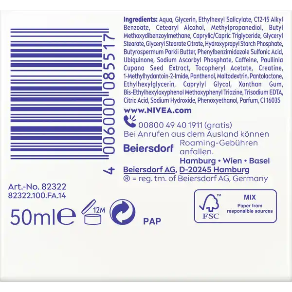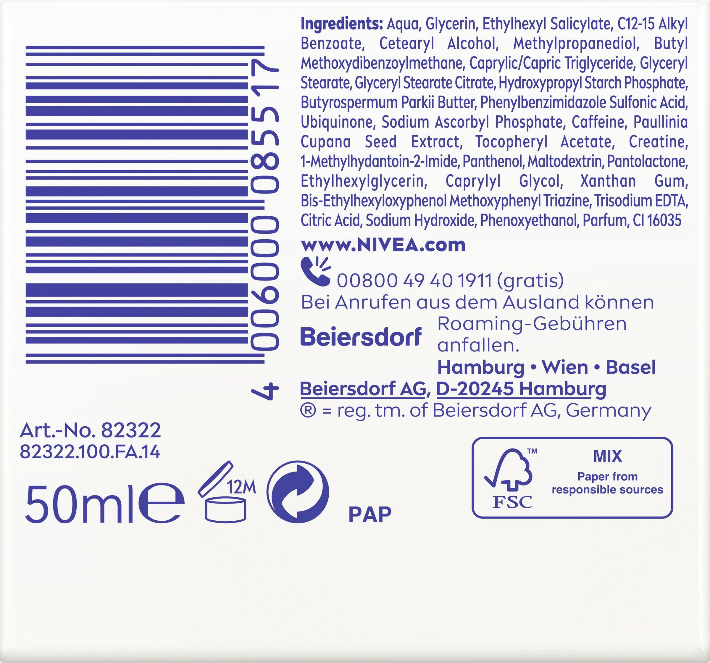 Verpackung - NIVEA Q10 Energy Anti-Falten & Anti-Aging Tagespflege, Gesichtscreme für Frauen angereichert mit Q10 & Vitamin C & Guarana, 1 x 50 ml, Artikelnummer 82322 Ergebnis: Fältchen und Fältchen werden reduziert, die Gesichtshaut wird 24 Stunden lang mit Feuchtigkeit versorgt und Ihr Teint strahlend gesund. Stumpfe & müde Haut – Diese Gesichtspflege für Frauen mit einer leichten Formel angereichert mit Vitamin C und Guarana ist perfekt für stumpfe und müde Haut, sie verleiht Ihnen ein sofortiges Gefühl von Weichheit und einen strahlenden Teint Sehen Sie sich das aktuelle Nivea Q10 Power Anti-falten Tagespflege angebote bei Marktkauf im neuesten prospekt an. Bleiben Sie per E-Mail über die letzten Marktkauf Aktionen, prospekte und angebote informiert Die gesamte NIVEA Q10-Serie ist speziell mit reinem Q10 formuliert, das die Zellen vor freien Radikalen und äußeren Schäden schützt, um Zeichen der Hautalterung zu bekämpfen. In nur 4 Wochen werden Falten reduziert und die Haut regeneriert*! Warnhinweise Nur zur äußerlichen Anwendung Sehen Sie sich das aktuelle Nivea Q10 Anti-falten Power Straffen,de Tagespflege Lsf15 angebote bei REWE im neuesten prospekt an. Energie in nur 24 Stunden , * Verbrauchertest, 110 Frauen, 4 Wochen. Radiance Boost Day Cream NIVEA Q10 Energy Tagespflege FPS15 (1 X 50 Ml), Anti-Falten Creme Angereichert Mit Reinem Q10 & Vitamin C, Anti-Aging-Creme Für Einen Strahlenden Teint, Energetisierende Gesichtscreme Für Stumpfe Und Nivea Gesichtscreme Frauen Es wurde für die Bedürfnisse müder und stumpfer Haut formuliert und mit Q10 mit Vitamin C und Guarana angereichert, unterstützt die Fähigkeit Ihrer Haut, ihren Energiestoffwechsel zu verbessern und hilft Ihrer Haut, freie Radikale effektiv zu bekämpfen. Ovis Anti-Falten Creme mit reinem Olivenöl 50 ml Die Vorteile dieser Creme: Anti-Falten & Anti-Aging Pflege GEPRÜFTE ERGEBNISSE - Mit dieser Gesichtscreme werden die Anzeichen von Müdigkeit bereits nach 2 Wochen* verschwinden. Collagen Duo Booster – Diese mit reinem Q10 & Kreatin angereicherte Tagespflege stärkt das Kollagen, reduziert Falten von innen heraus und verbessert die Zellkraft der Haut Für einen strahlenden Teint , LSF 15., Stumpfe und müde Haut Nivea Q10 Energy Tagespflege