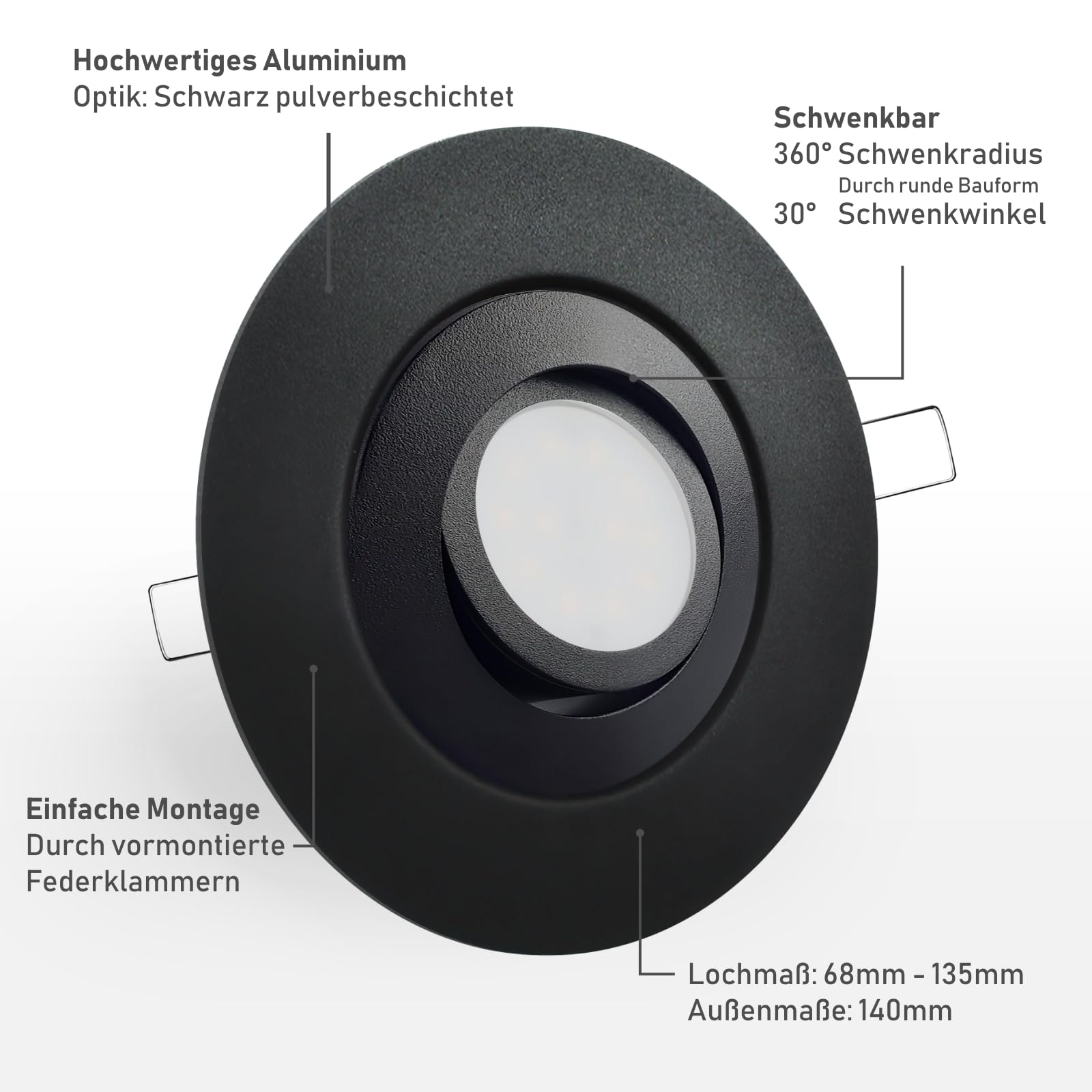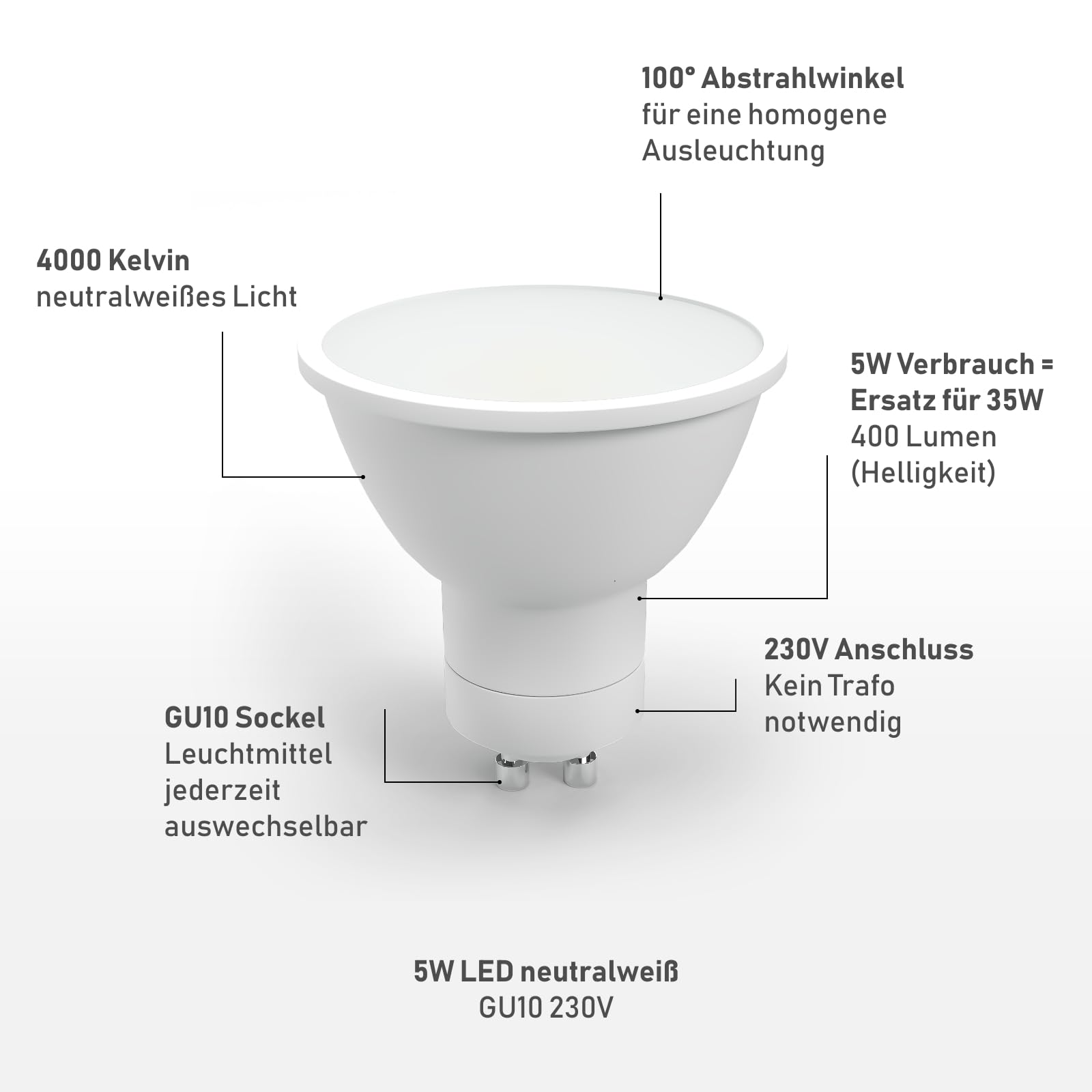 Led Einbaustrahler Gu10 LED EINBAUSTRAHLER NOBILE 5068 ECO Flat 8W Für 68mm Einbaudurchmesser Einbaustrahler Led Schwarz LED Einbaustrahler Spot eckig Weiß IP44 flach 230V für Bad Dusche 40W Halogen Besonderes: Lichtausbeute homogen verteilt Lichtstrom: 400 Lumen Abstrahlwinkel: 120° Farbtemperatur: 3000k (warmweiß) Material: KST CE: Ja Dimmbar: Nicht dimmbar Lieferumfang: 1x Einbaustrahler, 1x Ausgleichsblende, 2x Federverlängerungen, 1x GU10-230V-Fassung, 1x LED-Leuchtmittel warmweiß Ihre Vorteile: - kein Trafo nötig - lange Lebensdauer - beliebig erweiterbar - hohe Energie-Effizienz - geringer Stromverbrauch - Leuchtmittel austauschbar Material: Aluminium (rostfrei), Oberfläche: Schwarz Technische Daten: Produktart: Einbaustrahler, Einbauleuchte, Spot, Downlights Maße aussen ca., (mm): Ø 140 Locheinbaumaß ca. In der Ausführung mit LED-Leuchtmittel hier als 230V-Version wird die Leuchte direkt am Stromnetz betrieben, ohne das ein weiterer Transformator erforderlich ist. (mm): 60 Material: Aluminium (rostfrei) Oberfläche: Schwarz Schwenkbar ca: 30° CE: Ja Leuchtmittel: LED-Leuchtmittel GU10-230V Verbrauch: 5 Watt ≈ Leuchtkraft ca. In der Ausführung mit LED-Leuchtmittel hier als 230V-Version wird die Leuchte direkt am Stromnetz betrieben, ohne das ein weiterer Transformator erforderlich ist. Der Einbaustrahler verfügt über vormontierte Klemmfedern welche die Befestigung in Hohldecken ermöglichen LED Einbaustrahler Spot rund in Weiß pulverbeschichtet GU10 230V ohne Trafo. Passt für 68–135 mm Lochmaß. In Warmweiß, Neutralweiß, Kaltweiß oder dimmbar Lieferumfang (Stückzahl einfach eingeben): Einbauleuchte BIG Bajo K9451, Farben: edelstahl-gebürstet, chrom und weiss Fassung GU10 LED Leuchtmittel Einbautiefe ab der Auflagefläche: 6cm