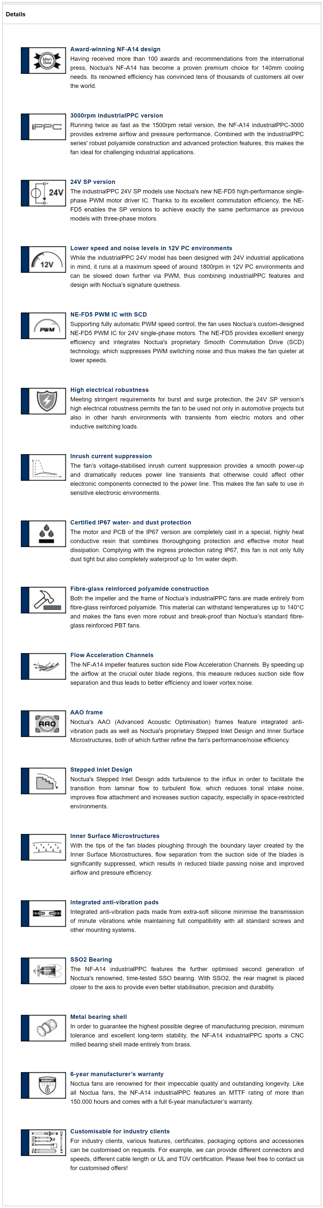 3000rpm industrialPPC Version Mit der gegenüber der 1500rpm Retail-Version verdoppelten Maximalgeschwindigkeit bietet der NF-A14 industrialPPC-3000 extrem hohe Förderleistung und statischen Druck. Protected Performance Cooling) ist eine robustere, schneller drehende Versionen des vielfach ausgezeichneten Retail-Modells. Robuste glasfaserverstärkte Polyamid-Konstruktion mit IP67 zertifiziertem Wasser- und Staubschutz Hochgeschwindigkeits-Variante (industrialPPC Reihe) mit extremer Kühlleistung für anspruchsvolle Industrieanwendungen und harsche Umweltbedingungen 24V, 3000rpm industrialPPC (Protected Performance Cooling) Version mit 4-Pin Anschluss und PWM Geschwindigkeitsregelung (1800rpm max., in 12V PC Umgebung) Pc Lüfter 140mm NOCTUA Noctua NF-A14 IndustrialPPC-3000 PWM, 140 Mm Noctua 24v NF-A14 industrialPPC-24V-3000 SP IP67 PWM Die ausgeklügelte Einschaltstrombegrenzung (Inrush Current Suppression), erhöhte Störfestigkeit (Burst and Surge Protection) und extreme elektrische Robustheit des NE-FD5 gestatten die sichere Verwendung in sensiblen oder harschen elektrischen Umgebungen. Ergänzt durch die von Noctua gewohnte Zuverlässigkeit und sechs Jahre Herstellergarantie ist der NF-A14 industrialPPC eine perfekte Wahl für besonders herausfordernde Anwendungen, die überlegene Kühlleistung und höchste Betriebssicherheit verlangen Bei SSO2 sitzt der rückseitige Magnet näher an der Lüfterachse und bewirkt so eine noch bessere Stabilisierung, was zu einer weiter verbesserten Präzision und Haltbarkeit führt. Der Schutzklasse 67 entsprechend ist der Lüfter nicht nur komplett staubdicht, sondern auch bis zu einer Tiefe von 1m wasserdicht. Zugleich garantiert das hochwertige SSO2 Lager eine MTTF von über 150., 000 Stunden. Niedrigere Geschwindigkeit & Geräuschentwicklung in 12V PC-Umgebungen Das industrialPPC-24V Modell wurde für 24V Industrieanwendungen konzipiert, lässt sich jedoch auch in 12V PC Umgebungen betreiben, wo es mit einer Maximalgeschwindigkeit von ca. Renommierter 140x25mm A-Serie Lüfter mit Flow Acceleration Channels und AAO-Rahmensystem für überlegene Performance SSO2 Lager Der Lüfter ist mit der weiter optimierten zweiten Generation von Noctuas bewährtem SSO-Lagersystem ausgestattet. Be Quiet Gehäuse Noctua NF-A14 IndustrialPPC-3000 PWM, 140 Mm Pc Lüfter 1800rpm läuft und zusätzlich über PWM gedrosselt werden kann. Dank der hervorragenden aerodynamischen Effizienz des NF-A14 Designs sowie des neuen einphasigen Motors bietet die industrialPPC SP Version mit ihrer höheren Drehzahl echte Hochleistungskühlung, verfügt dabei jedoch gegenüber vergleichbar schnell drehenden Lüftern über eine moderate Geräuschentwicklung und Leistungsaufnahme. Ergänzt durch die von Noctua gewohnte Zuverlässigkeit und sechs Jahre Herstellergarantie ist der NF-A14 industrialPPC eine perfekte Wahl für besonders herausfordernde Anwendungen, die überlegene Kühlleistung und höchste Betriebssicherheit verlangen.