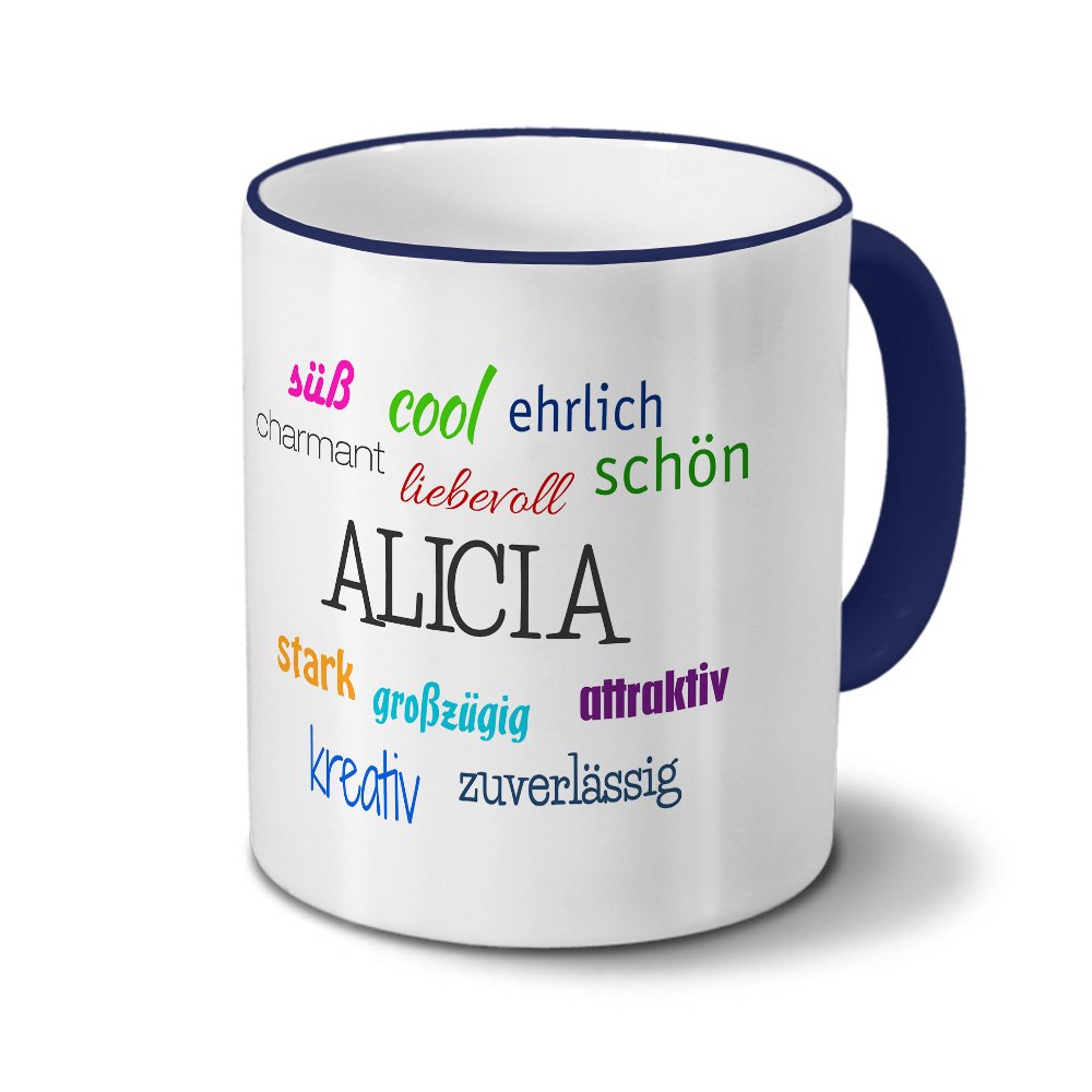 Becher und Druck in höchster Qualität. Material: hochwertiges Steingut (weiß lasiert), Henkel und Rand blau, Füllvolumen: 325 ml, Höhe: ca., 9,5 cm, Durchmesser: 8 cm Xxl Tasse 750ml Printplanet Tasse Mit Namen Alice - Motiv I Love Alice Alice Im Wunderland Tasse Bedruckt mit dem Namen Alice Brillant glänzender Aufdruck, spülmaschinenfest Die ganz persönliche Tasse mit magischem Namens-Motiv! Kaffeetasse mit dem Namen Alice bedruckt. Die personalisierte Tasse wird sofort nach Bestellung speziell für Sie in Deutschland und in Handarbeit produziert. Anderer Namenswunsch? Einfach in der Suche printplanet Tasse + Wunschname eingeben Originales Design von digitalprint Es stehen auch weitere Tassen-Designs mit einer Vielzahl von Vornamen zur Auswahl. Greengate Becher ALICE SKY BLUE Blau Die Tasse mit persönlichem Namen ist für die Spülmaschine geeignet und besteht aus kratzfestem Material. Personalisierte Kaffeebecher mit dem Namen ALICE in Zeichen Brief Fotos; Keramik-Becher; Benutzerdefinierte Kaffeetasse; Geschenke für Kaffeeliebhaber ... (1 Tsd Ein ganz besonderer Kaffee/Tee-Genuss für zu Hause oder das Büro.