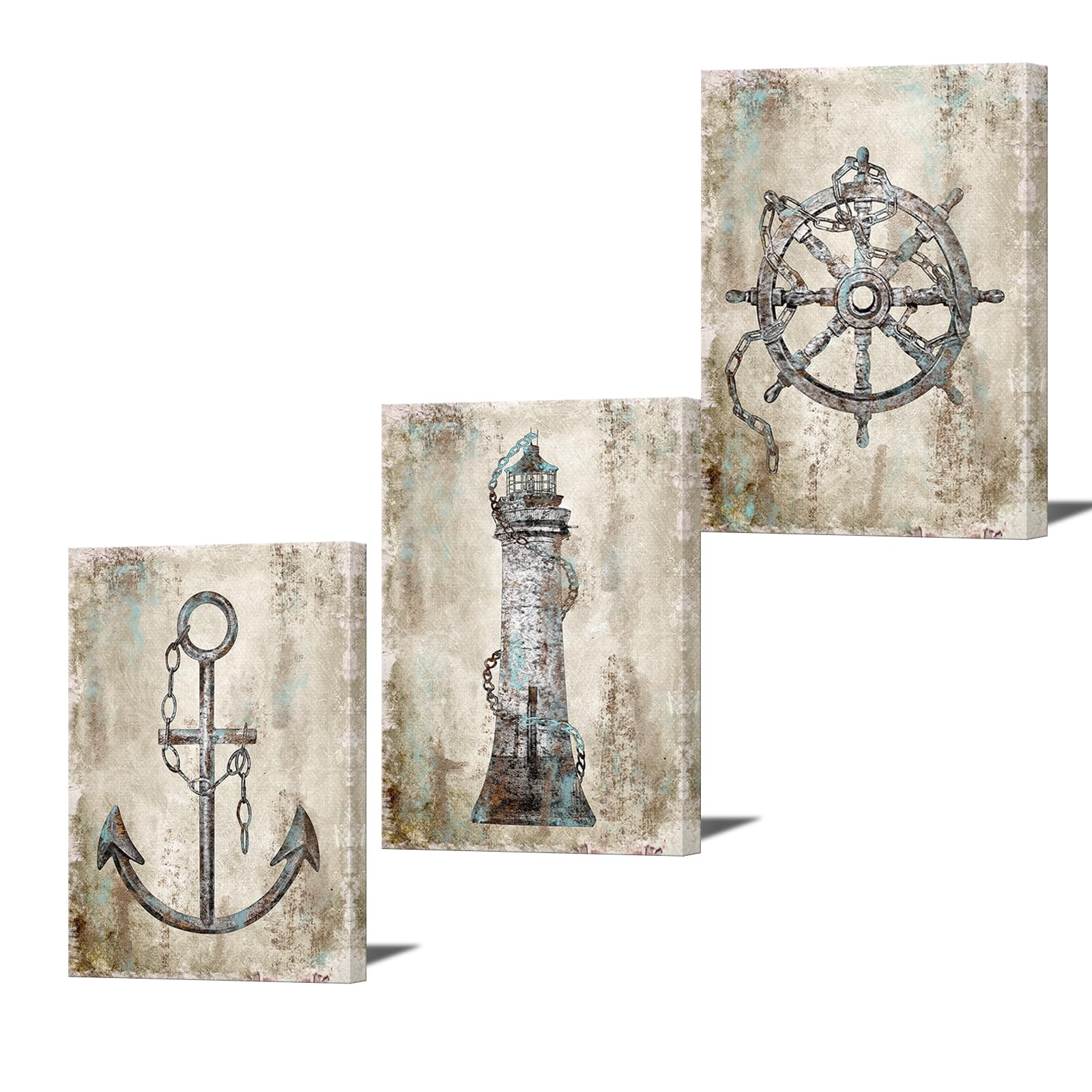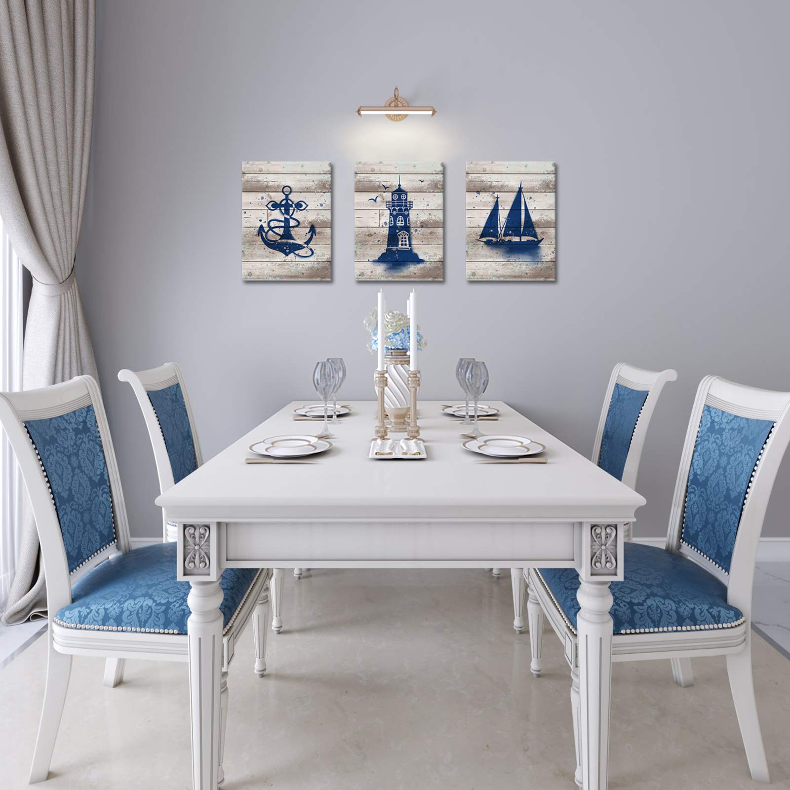 Fushvre 3-teiliges Nautisches Wandbild, Königsblau, Segelboot, Leuchtturm, Anker, Gemälde, Druck, Retro, Ozean, Themen-Poster Für Zuhause, Badezimmer, Gespannt Und Gerahmt, Fertig Zum Aufhängen