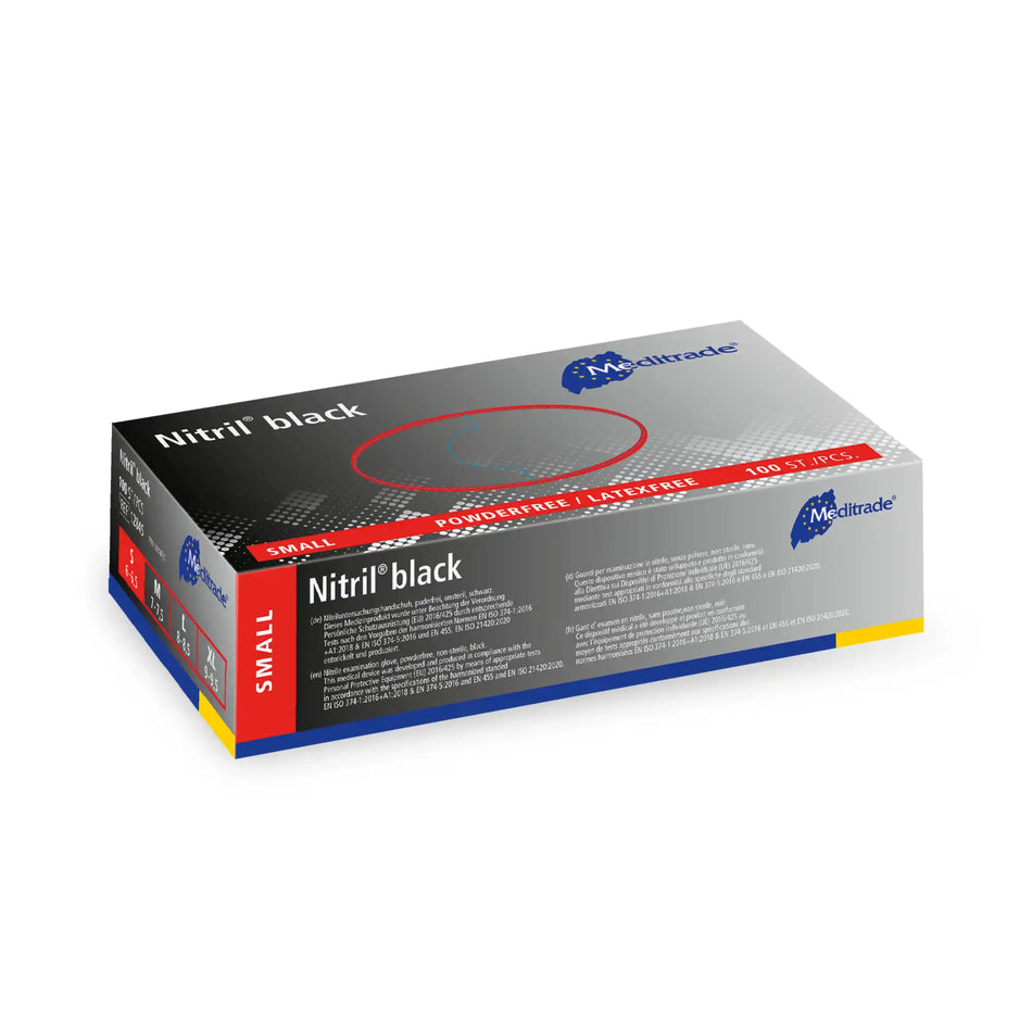 Meditrade Nitril Next Gen Handschuhe | XS bis XL Nitril Black für den Umgang mit Reinigungsmitteln und Desinfektion und für weitere Anwendungen in Labor, Pharmaindustrie, Reinigung, Catering und für den Umgang mit Lebensmitteln im Allgemeinen Geeignet für den Umgang mit Reinigungsmitteln und Desinfektion und für weitere Anwendungen Nitrilhandschuhe günstig online kaufen Anschrift Hersteller/Importeur neolab., de Ideal für empfindliche Anwender mit diagnostizierter Latexallergie (Typ I). 100 Stück Nitriluntersuchungshandschuh in schwarz, puderfrei, Größe L SF Nitrilhandschuhe M Schwarz – 100 Stück Einweghandschuhe, Einmalhandschuhe, Puderfrei, Latexfrei, Gummihandschuhe Einweg zum Kochen, Putzen, für Medizin, Küche, Garten, Werkstatt, Tattoo, Haushalt : SF Medical Products GmbH Sie sind ideal für den Einsatz im Labor, bei der Arbeit mit Reinigungs- und Desinfektionsmitteln sowie in allen nichtsterilen Bereichen von Krankenhaus, Arztpraxis und Pflegeeinrichtungen. Puder- und latexfrei Enthält kein MBT Allergiefrei Sehr tastsensibel Zertifiziert nach DIN EN 455-1, -2, -3, -4 sowie DIN EN 374-1, -2, -3 Unsteril Farbe: weiß Verschiedene Größen Beidhändig passend, mit Rollrand, schwarz, puderfrei, mikrogeraut, unsteril, für den Einmalgebrauch.