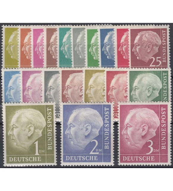 Große Auswahl neuer und gebrauchter Briefmarke Heuss 1954 online entdecken bei 791 - 825 komplett postfrisch 34 Marken + 1 Block Nr. 182-186, 5 Werte komplett, Michelwert 2018: 60 BRD 177-196 kompletter Freimarken Serie Theodor Heuss 1954** (Neu (gemäss Beschreibung)) in Berlin Nr. 182-186 Postfrisch ** Heuss Medaillon Briefmarke