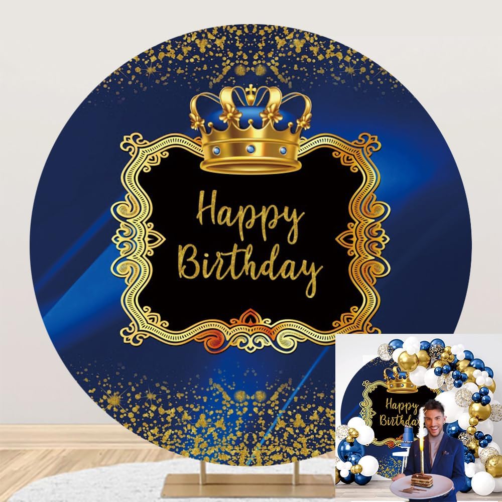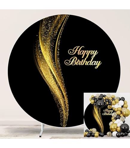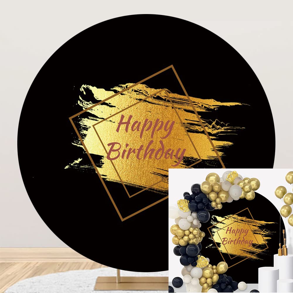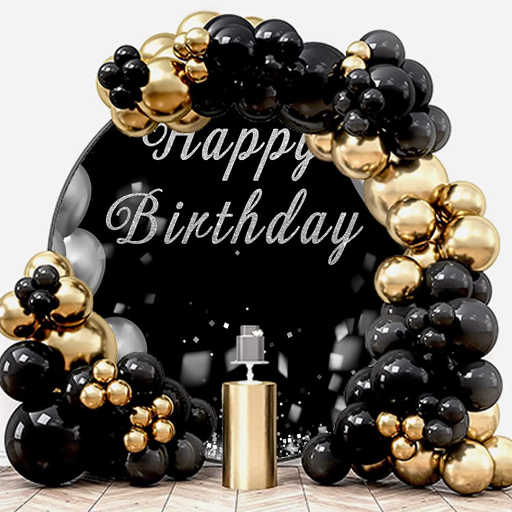 OERJU Black Silver Birthday Round Backdrop Cover Happy Birthday