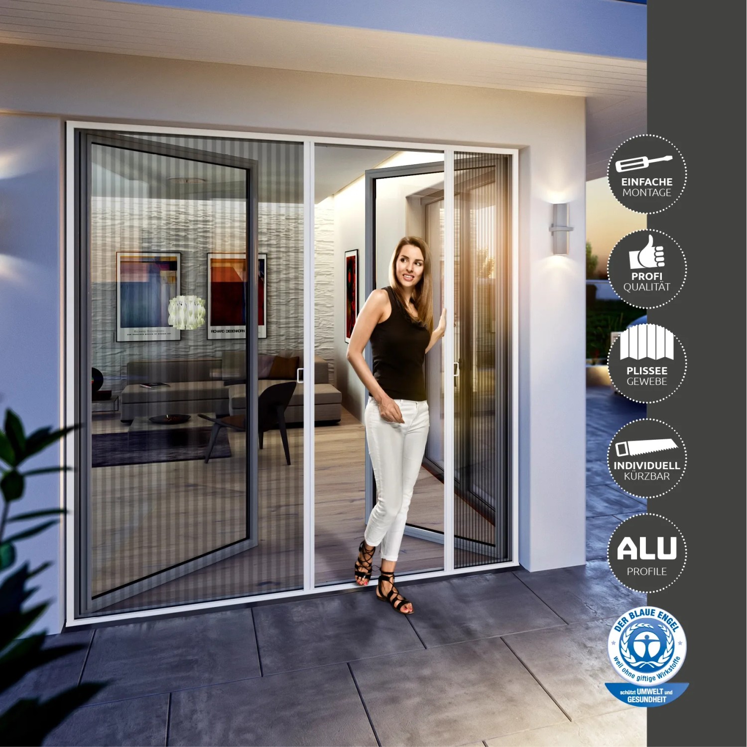 Fliegengitter Tür, 100 x 210cm Es ist robust, reißfest und kratzfest, so dass Sie sich keine Sorgen machen müssen, dass die Fliegengittertürmagnete in kurzer Zeit kaputt gehen. Der stärkere und stärkere Magnetismus bietet eine selbstdichtende Möglichkeit, in Ihr Zuhause zu gelangen und zu verlassen. 100 x 210 cm und 120 x 240 cm (einstellbar)Rahmenmaterial: AluminiumVerfügbare Farben für die Rahmen: weiß (RAL 9003), braun (RAL 8017) und schwarz (RAL 9011)Material des Gitters: 100 % FiberglasGitterfarbe: SchwarzDas Paket enthält1x Fliegengitter Tür PALMAT, Farbe und Größe: bitte oben auswählen1x detaillierte Montage- und Installationsanleitung Das Insektenschutz Plissee Expert von Windhager hält Insekten aus Ihrer Wohnung fern. Für beste Klebeergebnisse reinigen und trocknen Sie die Oberfläche ordnungsgemäß. Fliegengitter Tür Insektenschutz 102 x 200 cm Fliegengitter Balkontür Einfache Installation Auto Schließen Magnet Fliegengitter für Alle Universalfenster, Schwarz Starke Magnete für Selbstabdichtung und automatischen Verschluss: Mit durchgehendem Magnetverschluss öffnen und schließen sich unsere magnetischen Fliegengittertüren für die Haustür jedes Mal sehr leise und perfekt. Zusätzliche Reißzwecken sind im Lieferumfang enthalten für zusätzliche Sicherheit und Stärke. Einfach zu installieren: Fliegengittertür misst 101,6 x 210,8 cm, passend für Türgrößen: 96,5 x 208,3 cm. Die innovative Plisseetür kann in allen Positionen beliebig angehalten werden und ist sehr platzsparend. Fliegengitter Balkontür Ohne Bohren 102 X 211 Cm Fliegengittertür Polyamidfasergewebe ist viel stärker als gewöhnliches Polyester- oder Fiberglas-Türgitter. Doppelte Verstärkung: Breiter, selbstklebender Wasserhahnstreifen, 3,8 cm, sorgt für maximale Stabilität für längere Nutzung. Das Insektenschutzgewebe aus Polyester in Plisseeform ist sehr widerstandsfähig und dadurch für mehrere Jahre Einsatz geeignet. Im Sommer können die Fenster und Türen endlich wieder weit geöffnet werden und der Duft von Blumen und Wärme zieht in die Wohnung ein.