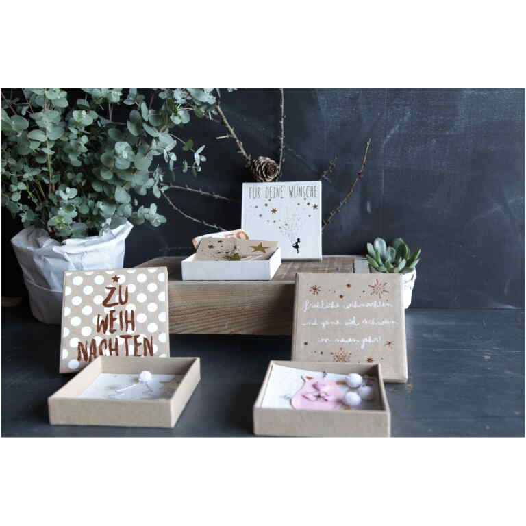 So wird das Geschenk doppelt wertvoll – einmal durch den Inhalt und einmal durch die schöne Verpackung. Die winterliche Gestaltung macht sie zur perfekten Wahl für die Weihnachtszeit, während die hochwertige Verarbeitung dafür sorgt, dass die Dose auch nach dem Fest als hübsche Aufbewahrung weiterverwendet werden kann. Geldgeschenkverpackung Schachtel - Winter Geldgeschenkbox - Weihnachtsgeld, good old friends geschenkartikel online kaufen, good old friends webshop, good old friends online shop, good old friends shop herrenberg | Kunst & Design Mit der Geschenkbox von Good Old Friends kann man formschön kleine und größere Geldpräsente überreichen. In der Papp-Box gibt es einen Einleger mit weiterverwendbarem Drahtanhänger in Form eines Tannenbaums - darunter legt man das Geld, drauf kann man einen kleinen Text schreiben Nutze sie für deine besonderen Geschenke und lass dich von ihrem festlichen Charme begeisern – das perfekte Stück für deine stilvollen, winterlichen Geschenkmomente ! Ob als kleines Extra unter dem Baum oder für Herzenswünsche – diese Winter Geldgeschenkdosen machen jedes Geldgeschenk zu etwas ganz Besonderem. Good Old Friends Geldgeschenk-Boxen Zur Hochzeit Winter und Weihnachts Geldgeschenkbox Flocken Eine WEIHNACHTS- Box mit besonderem Wert... mit diesen quadratischen Boxen wird Geld zu einen ganz besonderen Weihnachts-Geschenk